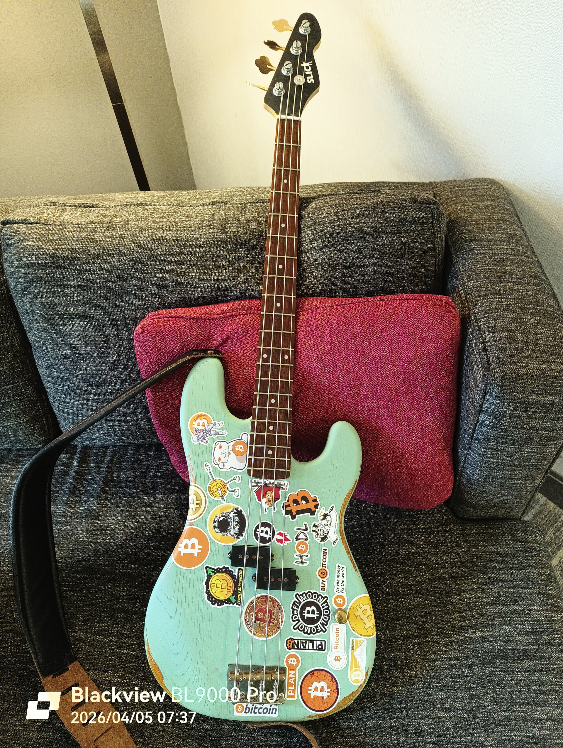 My Slick P Bass sitting on the couch in my hotel room. It was only $220 delivered. It makes the perfect instrument for this kind of thing. All I did was put new strings on it and it plays killer. And I didn’t have to worry about my nice Fender, Seymour Duncan, or Schecter basses. Being cheap is also why I had no problem customizing it with a bunch of stickers. Bought a 100 count Bitcoin sticker pack and went nuts with it right after I bought it. Overall it’s a pretty good bass. It has 1 knob. It’s brass too. It’s relic’d on the body and even the pickup. The neck is unfinished and feels good. The big difference in quality is felt where the fret ends aren’t as sweet as on my more expensive basses.