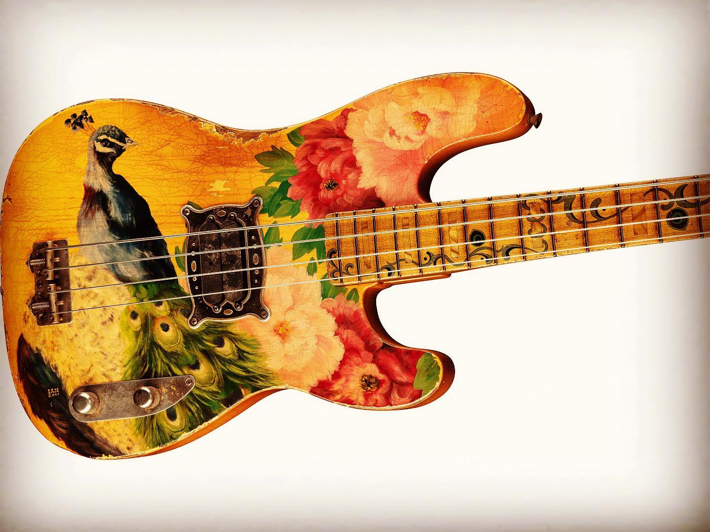 Vincent Van Trigt has built the only bass of the bunch: the Peacock Precision Bass, which is seen as a spiritual sequel to the Flamingo Telecaster he created for last year’s Prestige Collection. Once again, Van Trigt worked with aviary enthusiast Ian Ward for the build, which features Ward’s artwork and inlays, Josefina Campos hand-wound pickups and custom mounted rings.