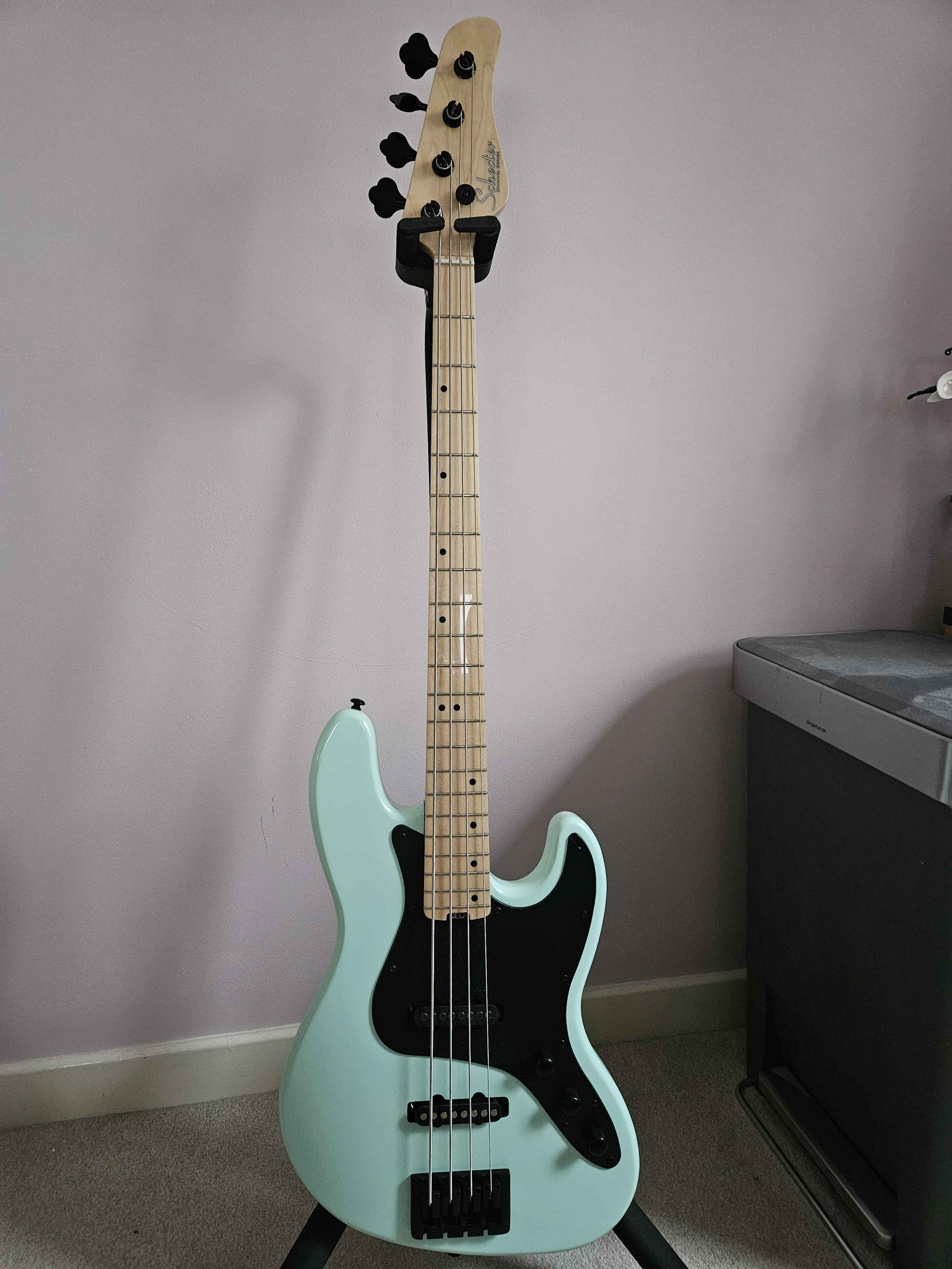 Currently I own a Fender Player II Modified Jazz Bass, and while I like the bass and enjoy playing / owning it, my eye has been rather drawn by the Schecter J4 in sea foam green. Everything about the design of the J4 is very me and I’ve been considering picking one up since my annual bonus came in.