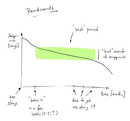 Personally, I don’t like the amount of zings coming from a brand new string, and I prefer them after a few weeks of being broken in. How long they last depends on many factors (already discussed in the thread), but once they’re below your threshold of zings then that is the time to change. Your green area can be shorter and narrower (or longer and wider) than somebody else’s, and the slope can be dependent on manufacturer, usage, etc.