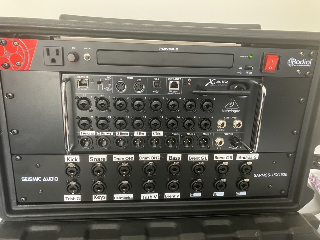 XLR into the Seismic Audio XLR splitter. 1/2 signal goes to a 30’ XLR snake with the XLR tails for FOH. The other 1/2 goes into the front of the Behringer XR18 digital mixer.