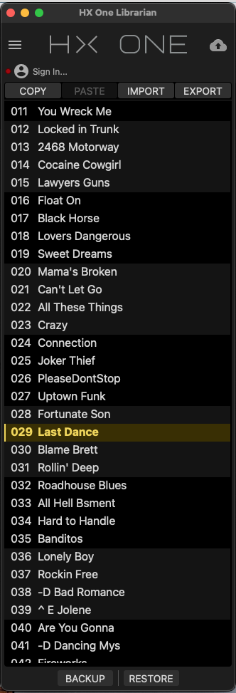 Then I use my HX One to add a specific effect (if required for each song). I can store the effects in a list and rename them as the song title. I can use HX Librarian to drag / drop and rename my list to the next gig’s set list. Our guitarist has the Line 6 Pod Go and does the same as me. He can create chains of effects and save the preset as the song name. It’s fantastic.