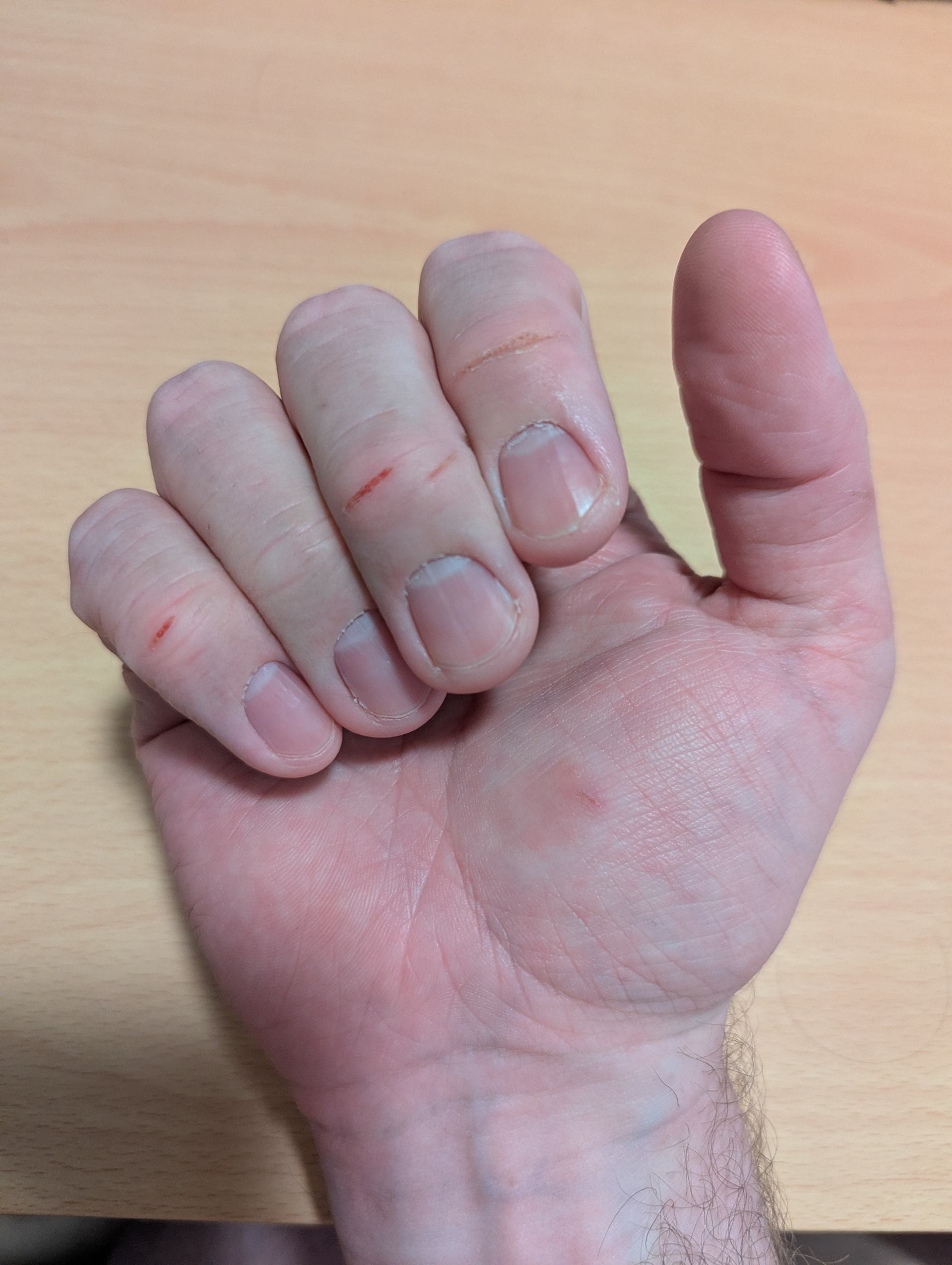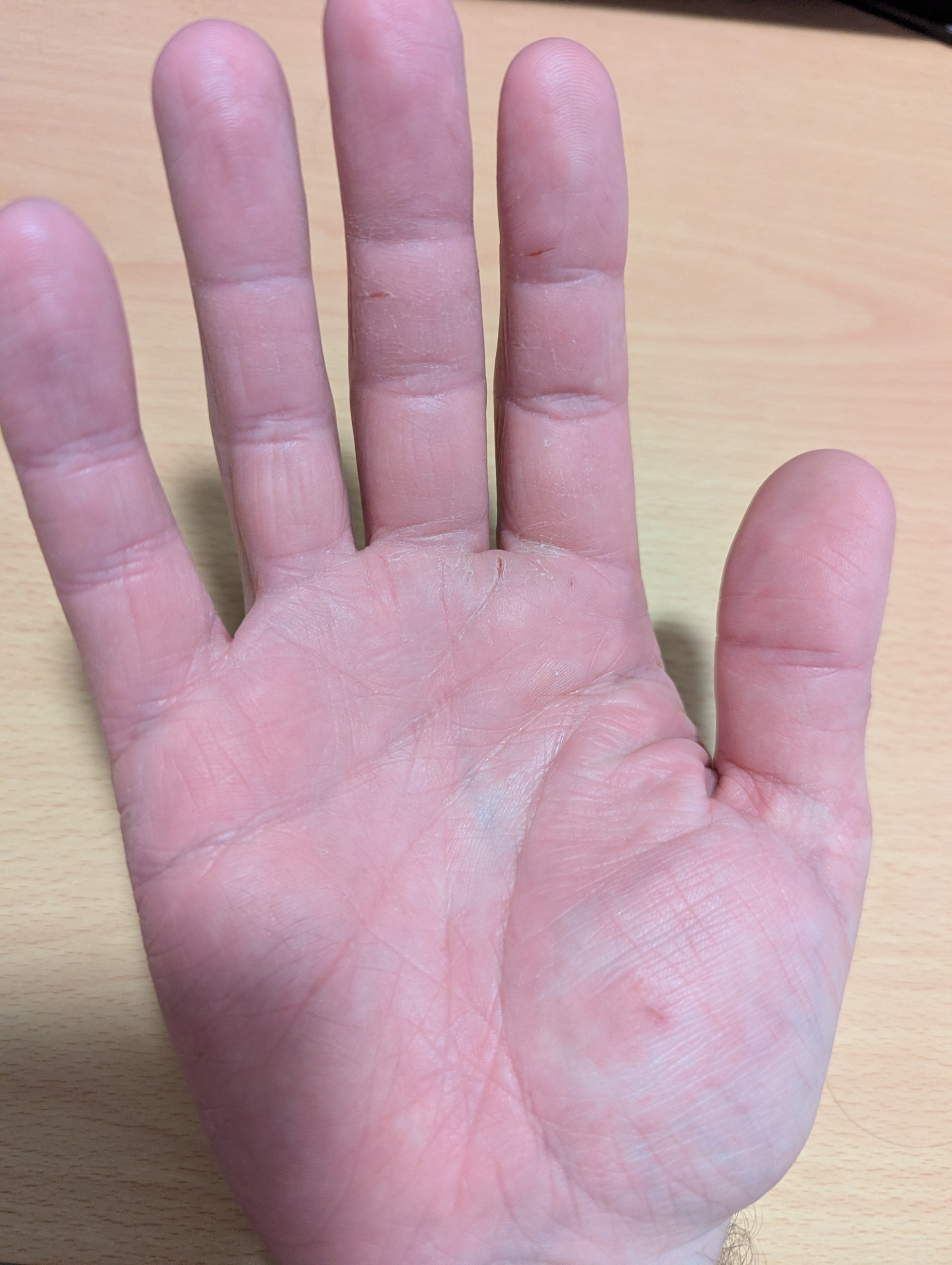 I’ll post a couple pictures of what it looked like on my hands for reference in case someone else stumbles onto this in the future looking for answers. You can see the splits it was giving me in the grooves of my fingers and the dry/irritated spots on my palms as well as the cracking and bleeding in my knuckles, and this amount of damage was done in about a week, even with a medicated salve that treats it. So if you happen to see the same issues on your hands, this is something to look into.