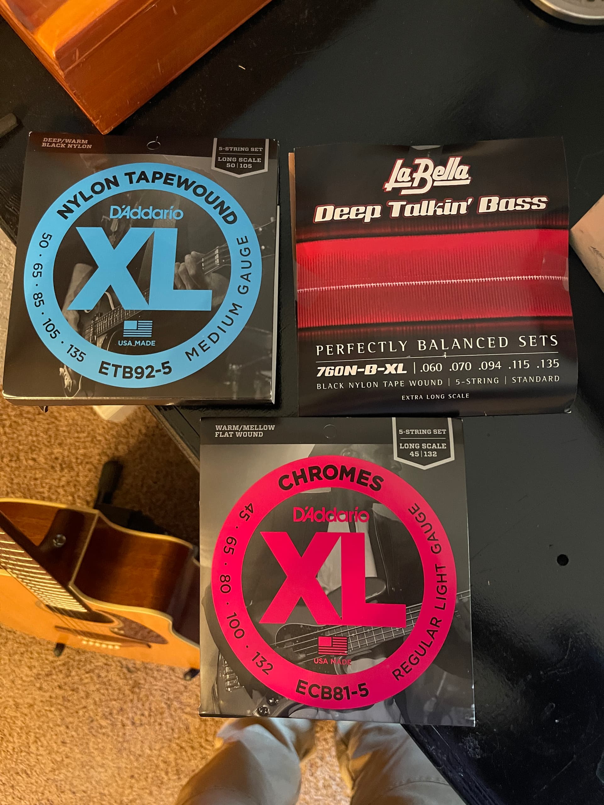 I moved to a 5er last year when I began to realize that much of the music I play is either new Country or Gospel. I have my Ibanez 505E strung with D’Addairo XL Chromes at the moment, but swap out to LaBella DTB’s depending on the style of music (mainly Country or Rock) that I’ll be playing. My Fretless Lakland Skyline 5’er pretty much stays strung with D’Addario XL Tape Wounds since they play and sound awesome - especially in some of the Gospel and Blues that incorporate more slides. Also, these strings really help emulate more of a smooth deepness in tone “somewhat” comparable to an upright. This is by far my most “fun” bass to play since I get absolutely zero fret buzz (duh - no frets to buzz anyway)![]()