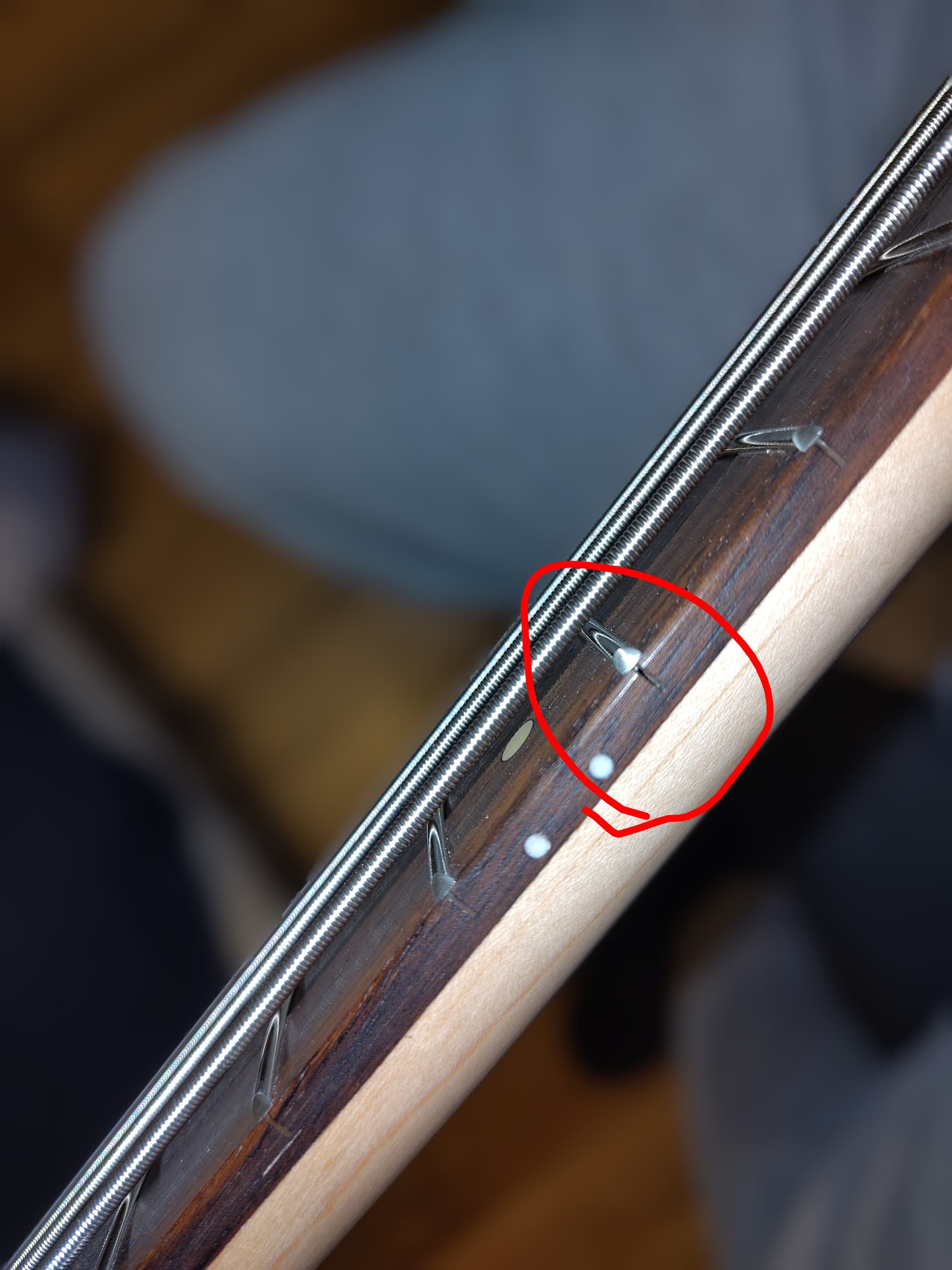 The fret looks flush on the board to me, I’d play it. Could’ve been like that from day one. You can get that one replaced if you want or get a Luthier to look the whole bass looked over and come up with a plan. Play it enjoy..