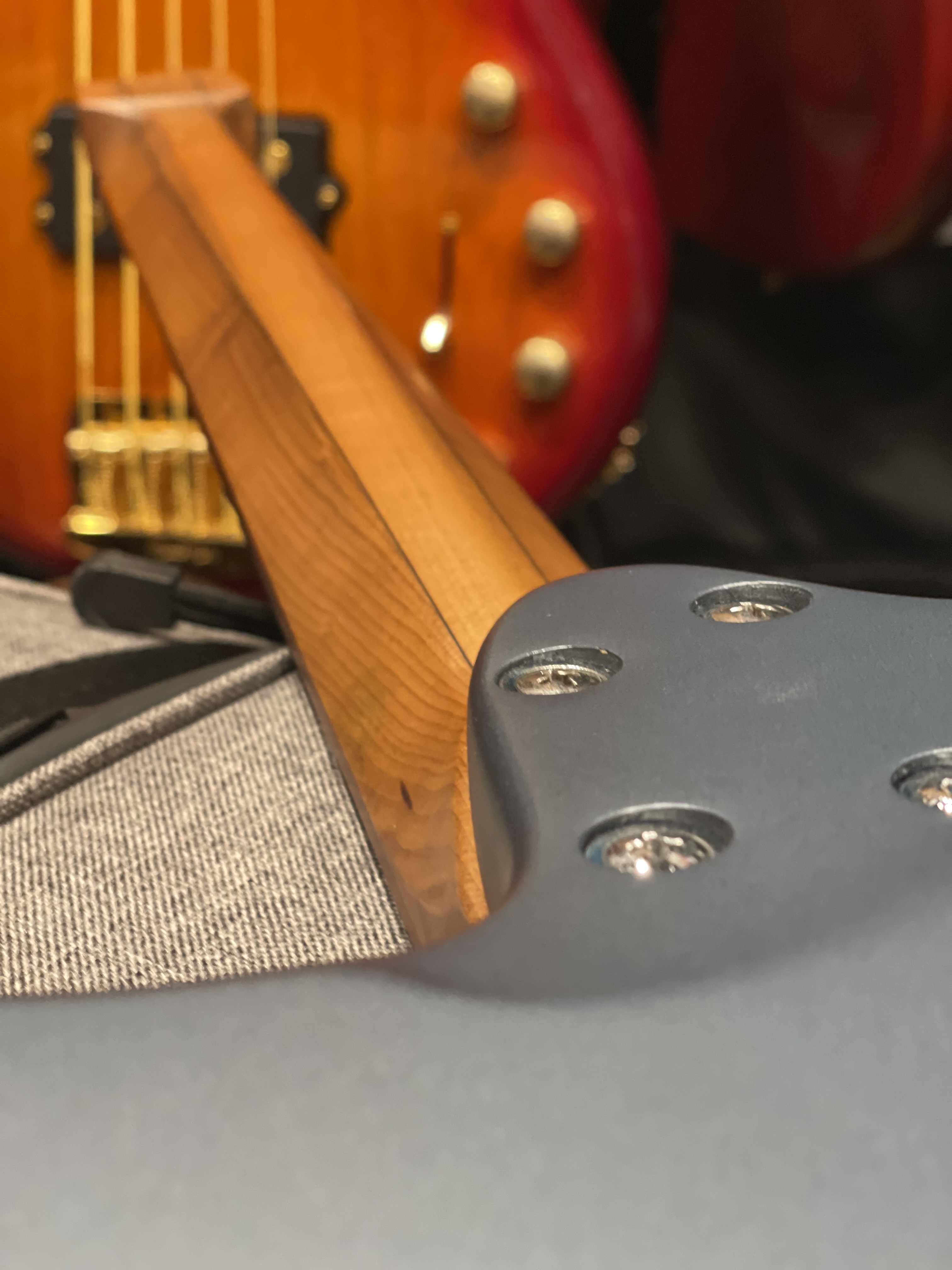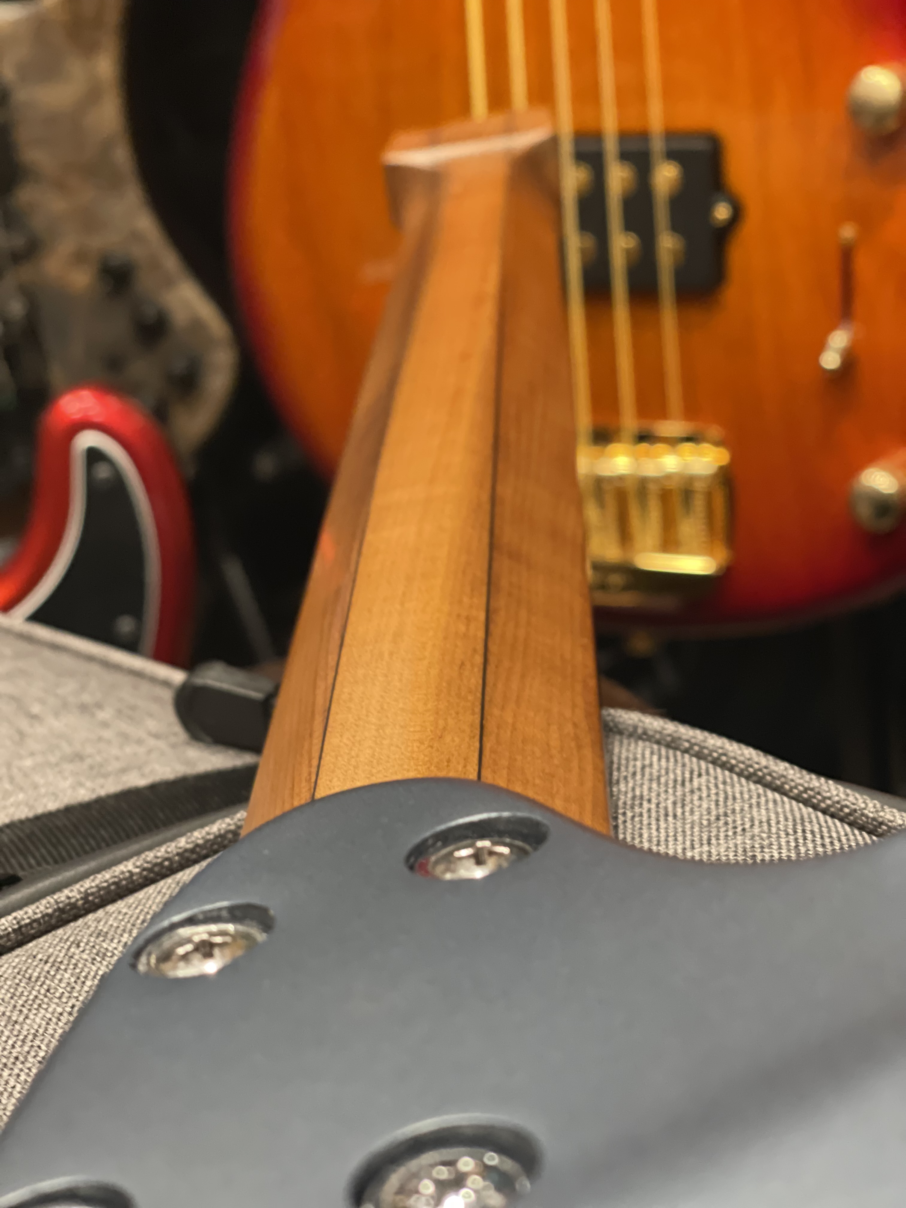 Again it’s trials and errors. Chopping a head stock off and converting it to a headless requires some tinkering, where to bolt on the string retainer and adding the bridge tuner. Do you want to break the string at the headless end (too) or at bridge end. The “Fender” headstock is not at the same level at the nut. Here some of my headless