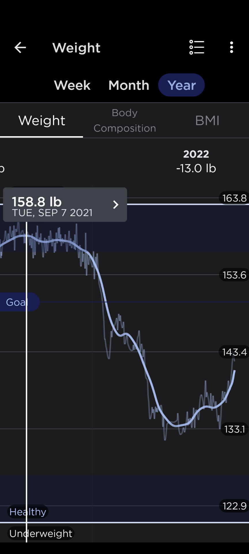 My weight plummeted from nearly 160 lbs in September 2021, to a low of 133 in June of this year. I’m now approaching 144, with a goal of 150 (ideal for a 5’8" female).