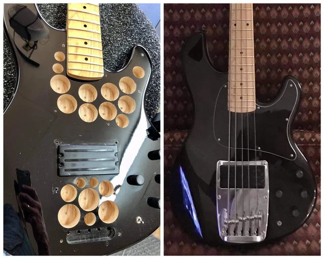 Auch! Is this real? I wonder why the front of the bass instead of the back. Maybe the person who did this liked the way it looks. What would this do to the sound?