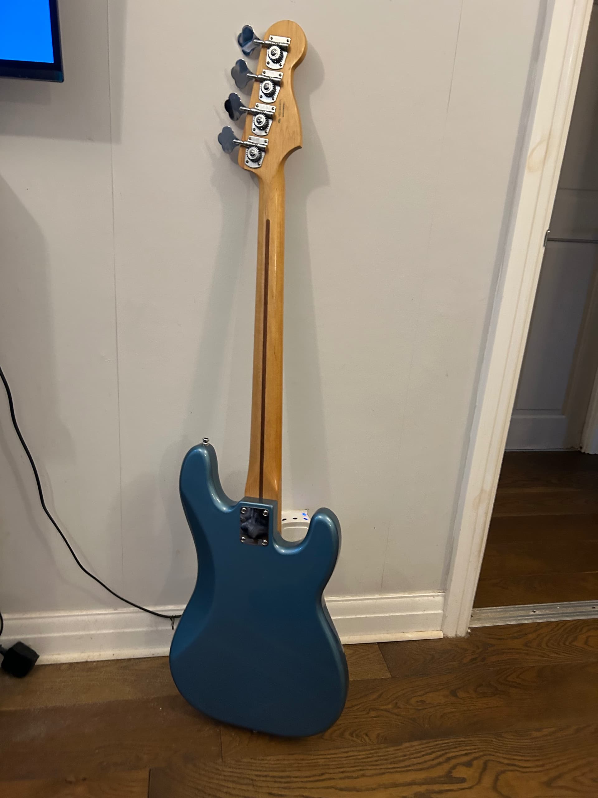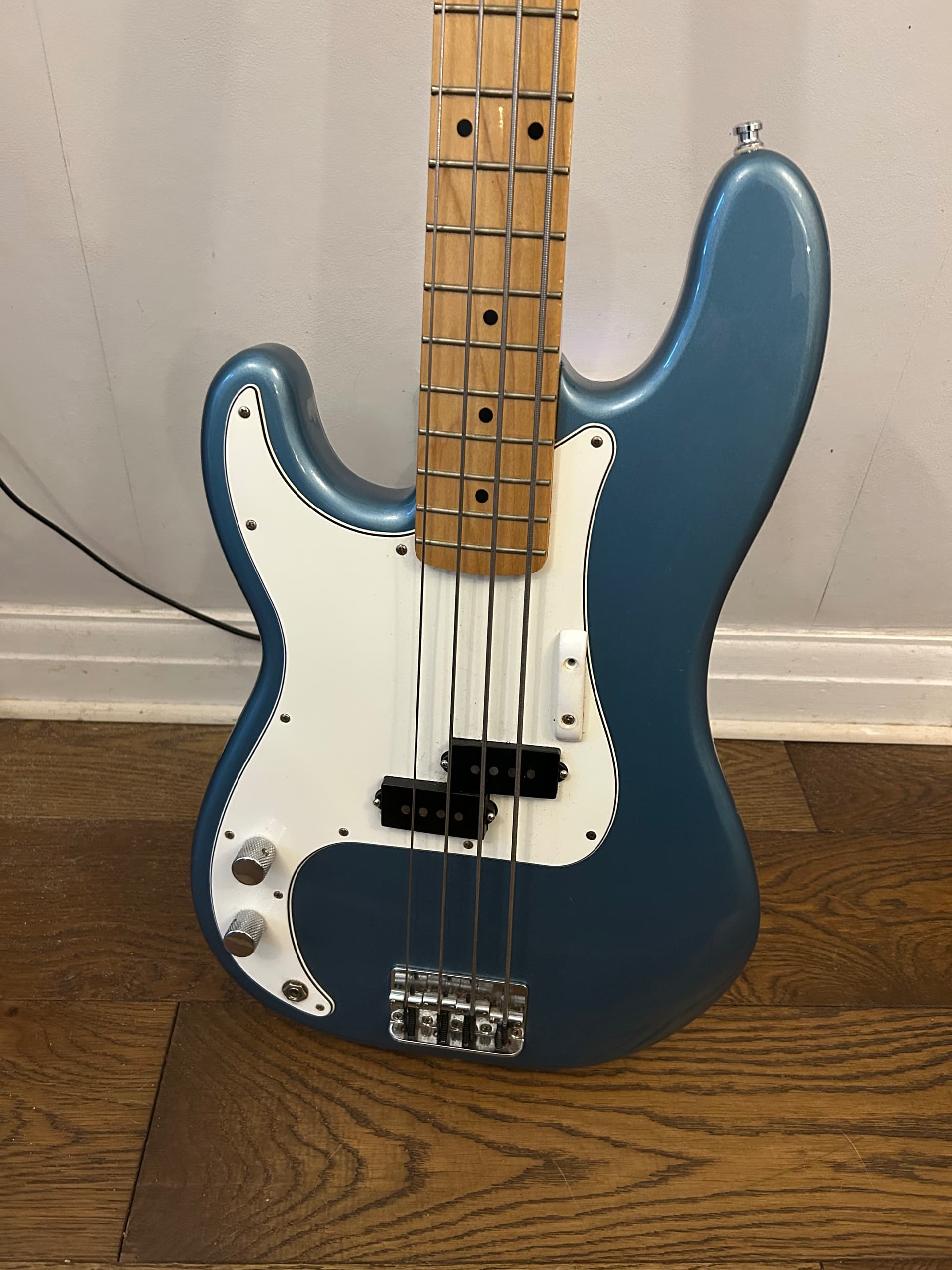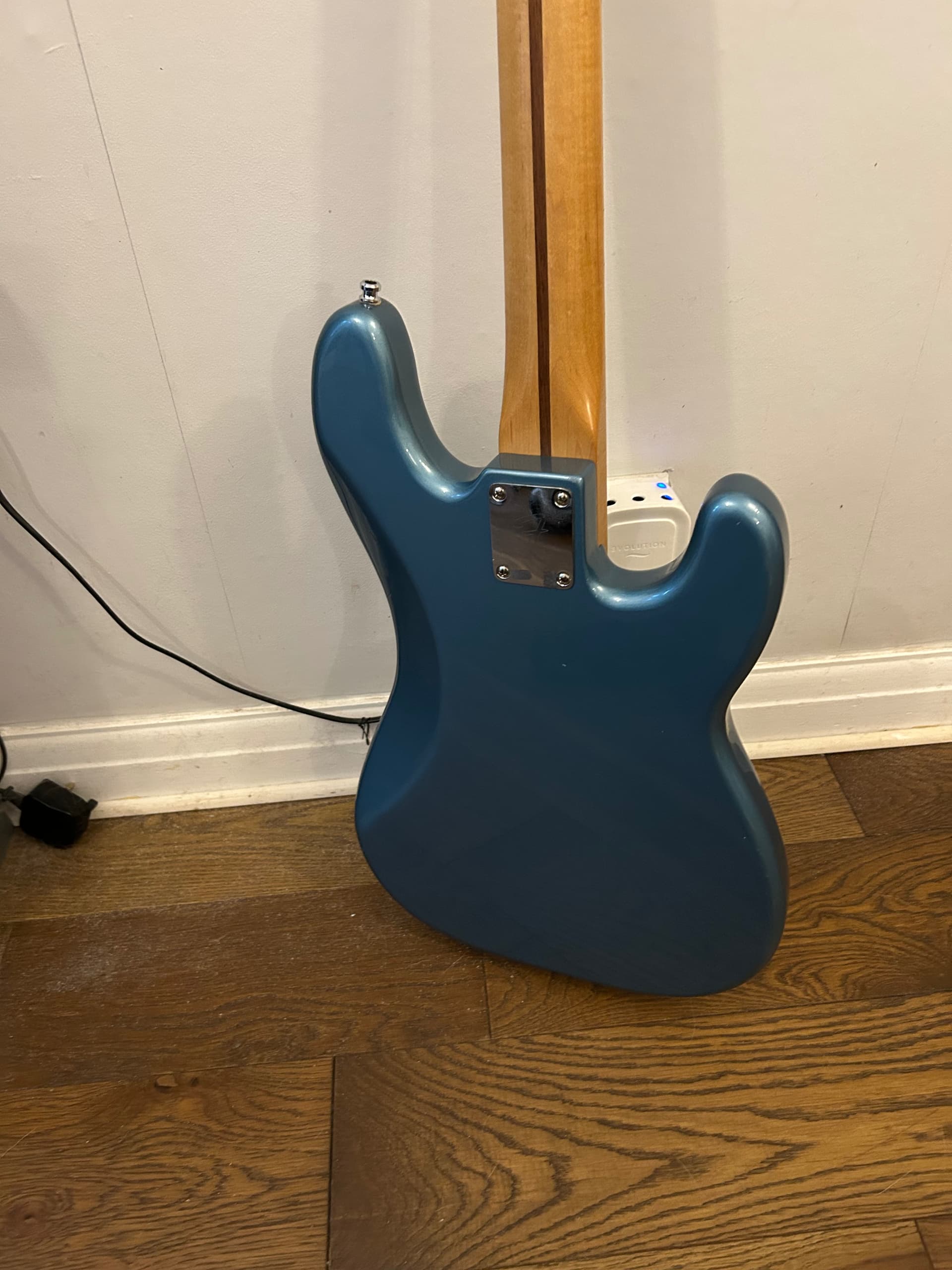 Ok, I have my first bass. It was a present for my birthday. A Left Hand Fender Stabdard Bass in Blue. Now I just need to sign up and learn to play it.