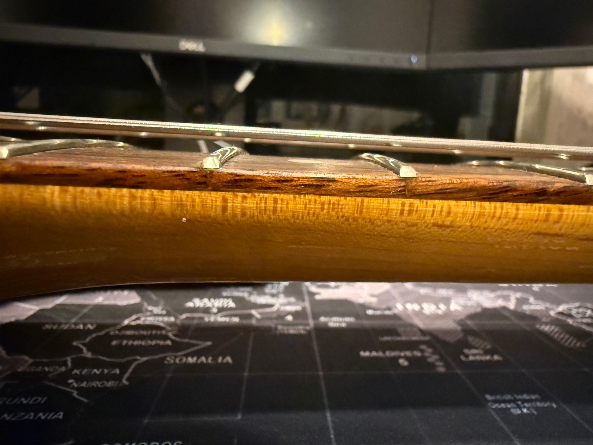 Bridge photo and side photo at the 12th fret (unfretted) just to show I don’t have crazy high action.