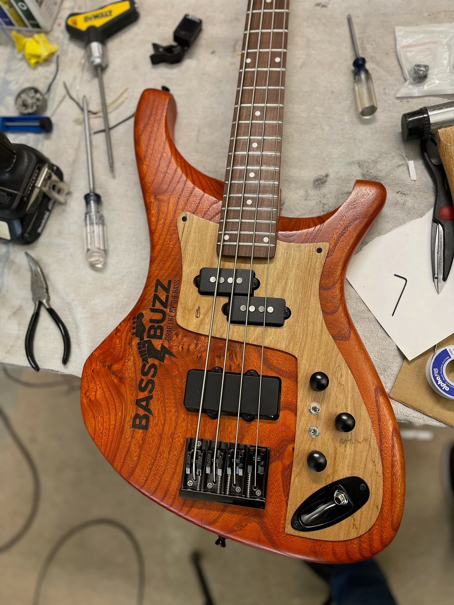 I want to! I want to get some vinyl stickers made of letters that spell HUSTLER and put them on the lower bout, and I want to make a little yellow cravat for him to wear across the nut.