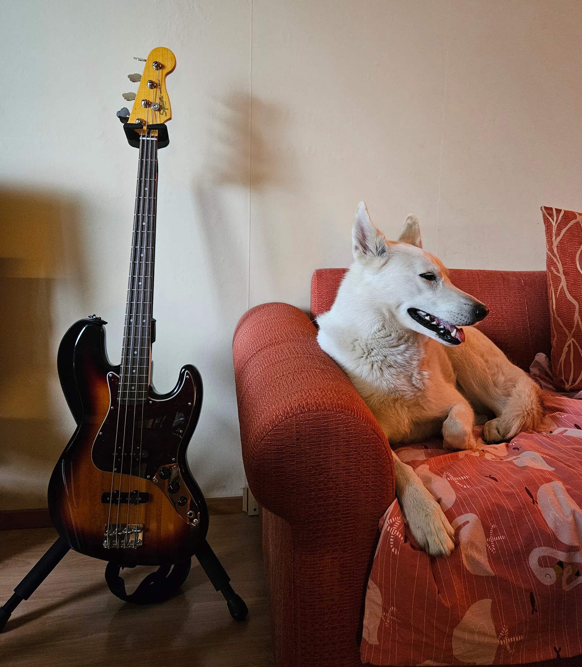 My dog was only interested in seeing and sniffing the bass when she saw it for the first time. After that, she hasn’t been interested in it at all. She walks past me while I’m playing, when she’s going to the balcony, and stands in front of the door so I have to get up and open the door for her. I also have to stop playing and go open the door again when she wants to come back in.