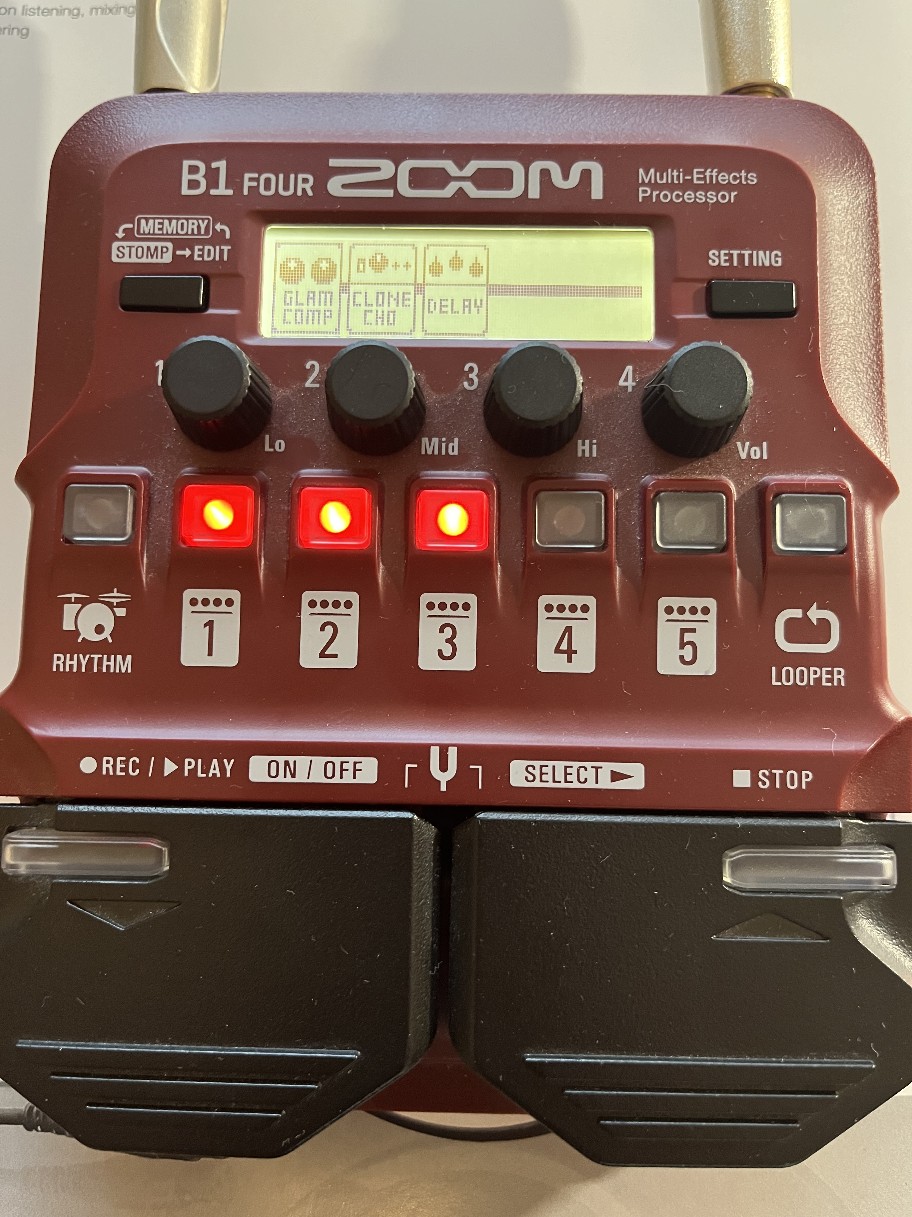 Prince recorded the song in 2008 and it features his classic, dreamy, chorus heavy guitar sound. I played along on the Steinberger, in drop-D tuning, and thought my Zoom B1four’s GlamComp patch fitted with the song’s vibe pretty well. So that is what I used that when I recoded the bass line, via the Scarlett Solo into GarageBand, i.e. there was no further processing in GB.