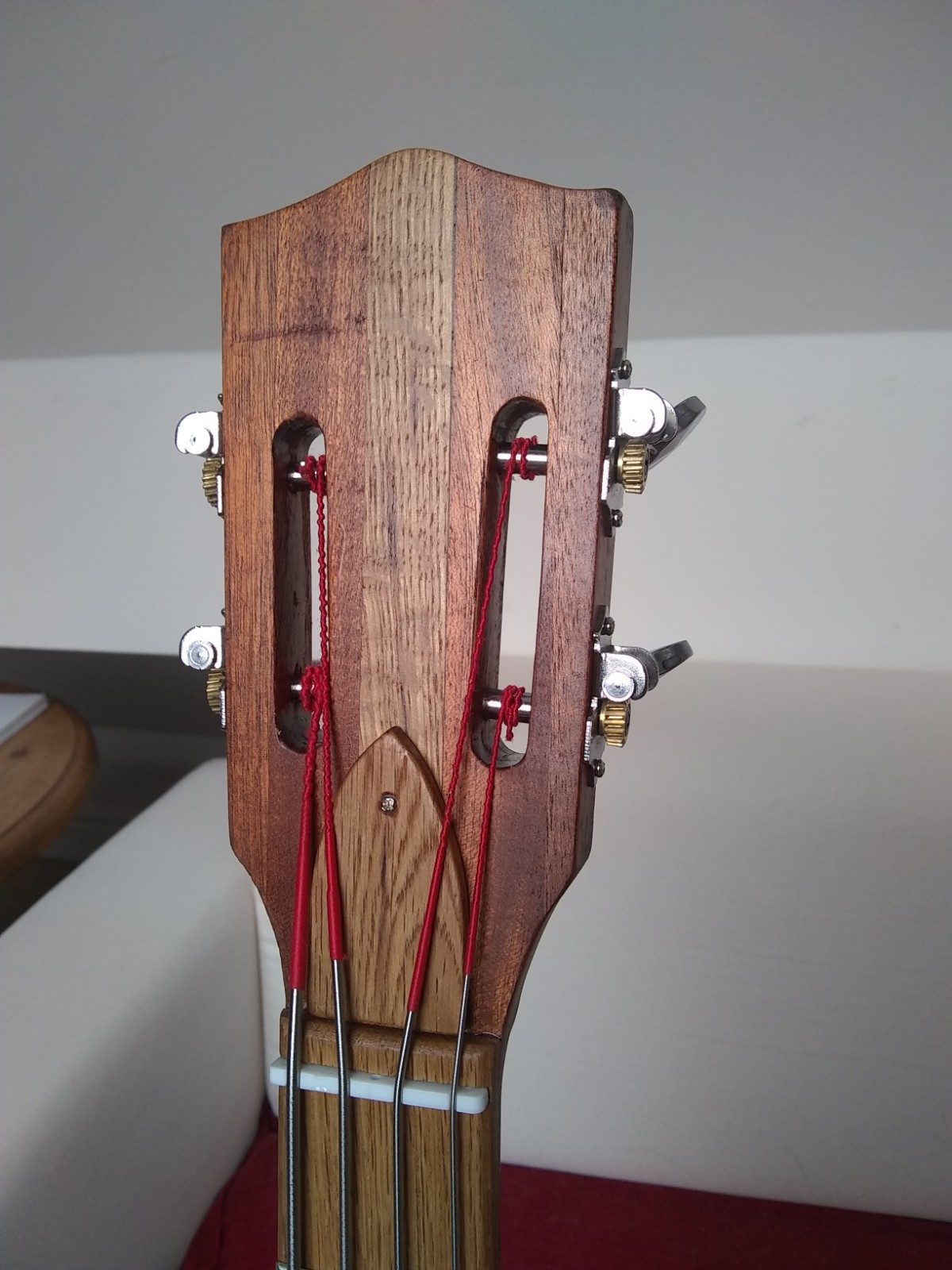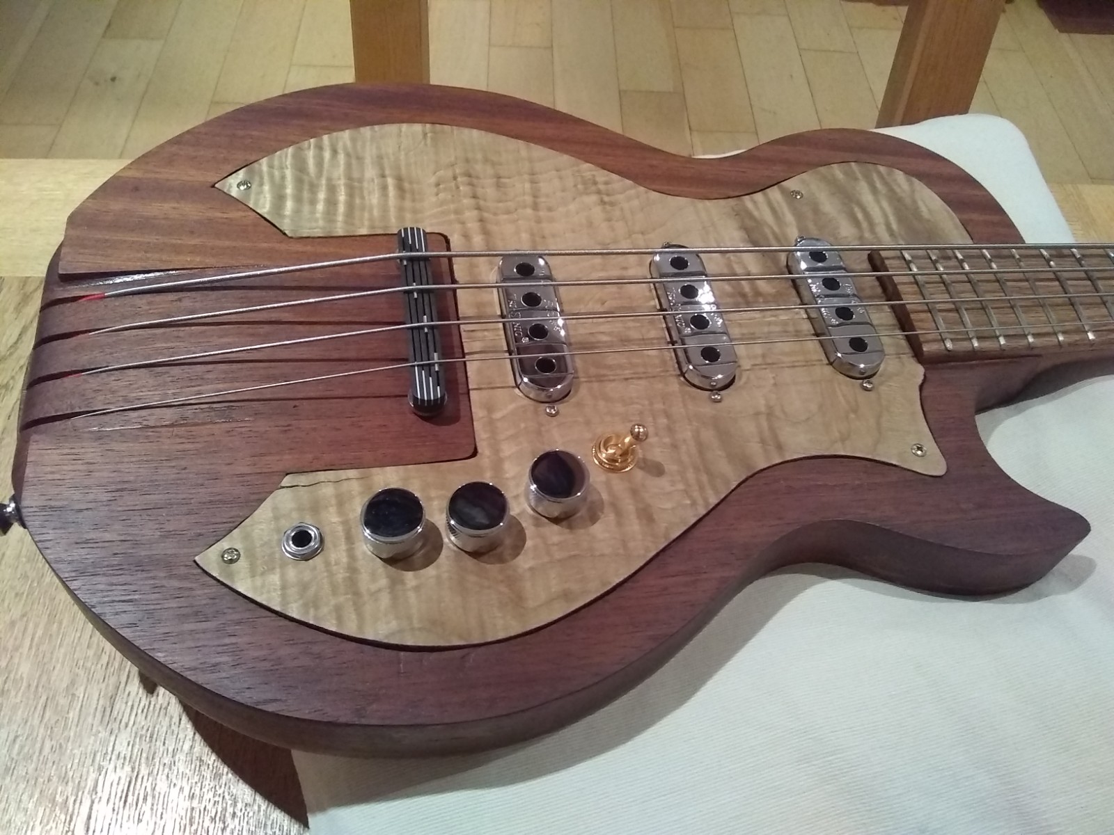The neck is a laminate of oak and mahogany with an asymmetric profile, with an oak fretboard (I had a couple of old oak floorboards hanging around the garage for a couple of decades, and some mahogany offcuts from the last bass neck I made).