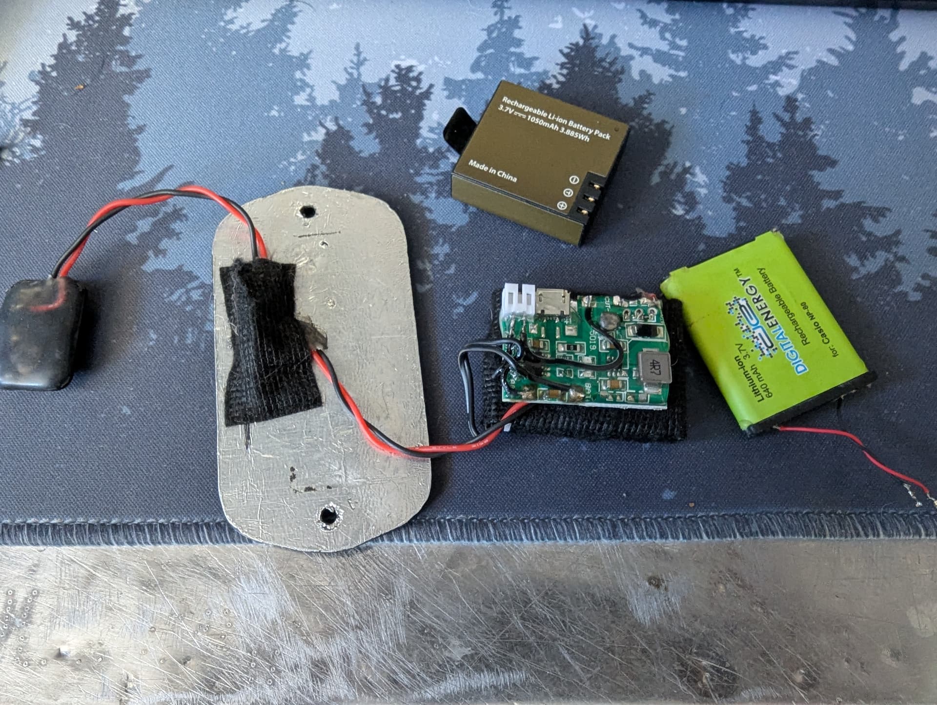 The green battery in the photo is the type I’m using now (see it wrapped in fuzz tape under the board). It fits barely but is a bit wide for the pocket in the guitar so I’m thinking about designing my own board to clip on the brown “action cam” style battery that has a less squashed profile.