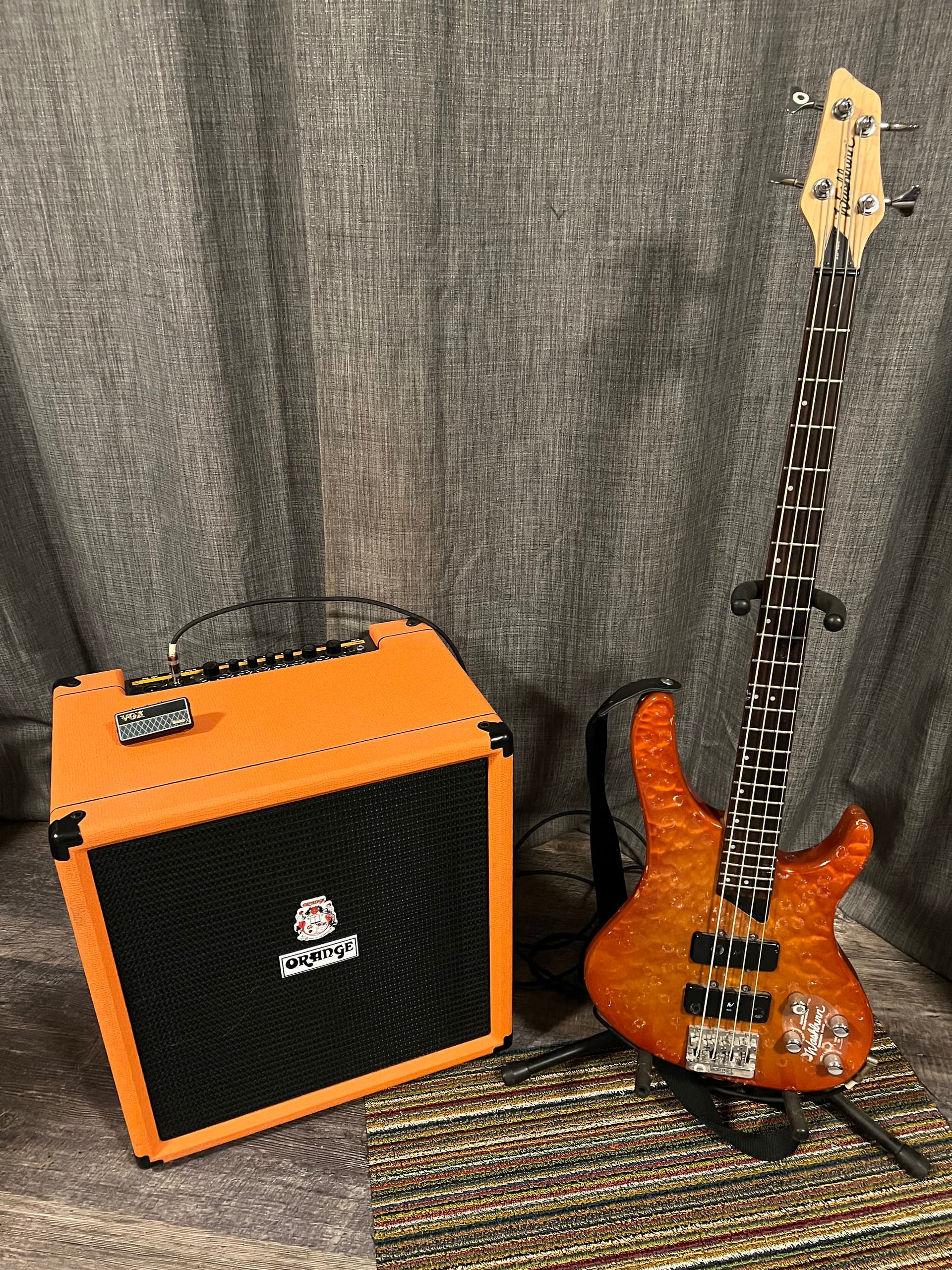 I picked up this Washburn XB-400 years ago for $59. Now that I know the active pickups are 90% shot, and that it’s impossible to source OEM replacements that aren’t just as old or used, I know why it was inexpensive. But it has a super-fast neck, a pro setup, and good looks. I’ve ordered a modern substitution set of soap bars (Fishman) and expect to be squeezing a little more sound out of this rig soon. The amp is an Orange Crush Bass 100 – I won’t know how good it sounds until I get the instrument issue squared away.