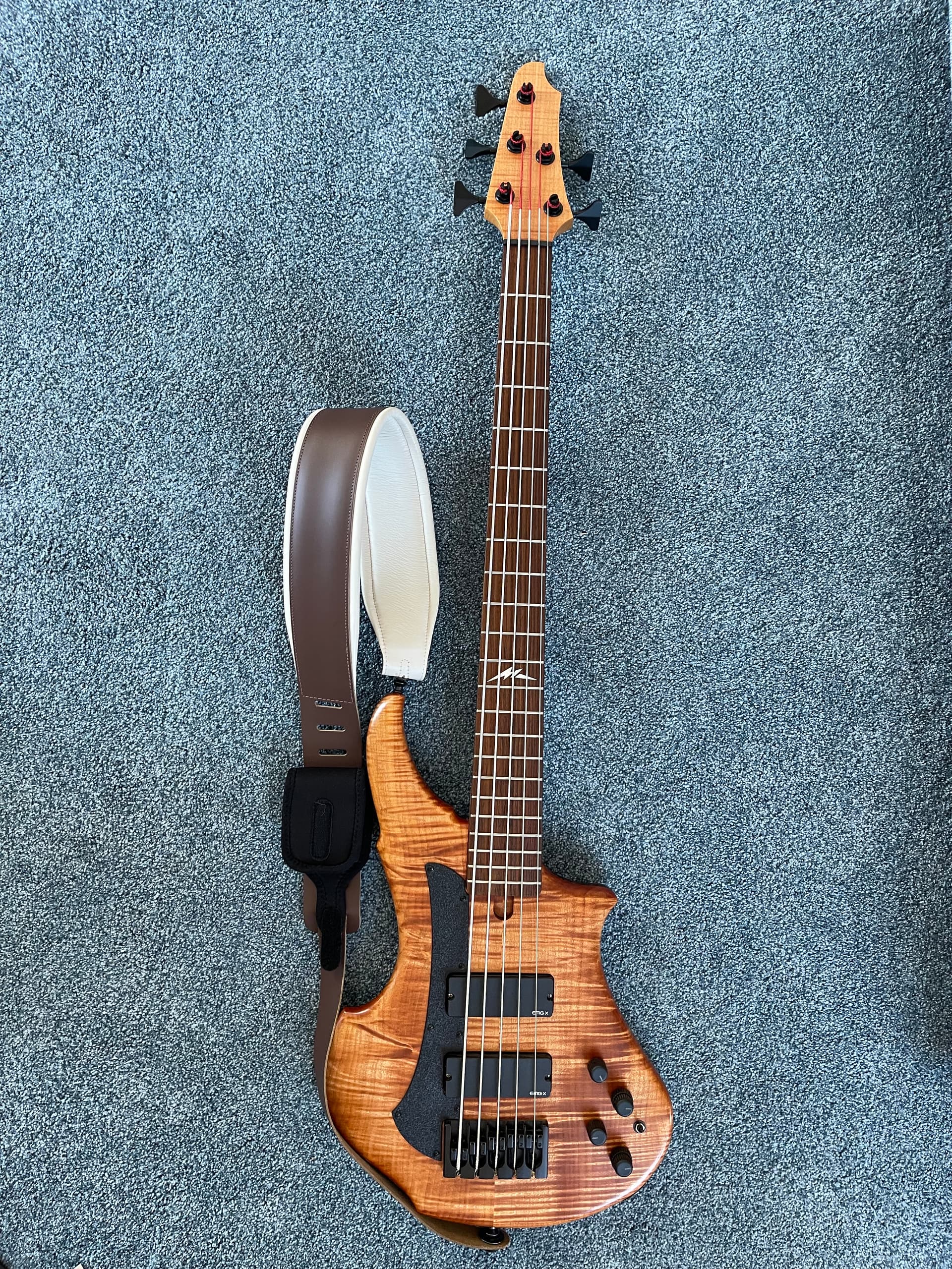 Last November, my daughter finished her PhD in Vancouver, so naturally it was an excuse to go to some local music shops. This beautiful beast followed me home. It’s a one-off instrument named a Volcan-5 made by Meaulnes Laberge who’s worked with several music manufacturers. The EMG pickups are different for the neck and bridge and have individual volume control into a shared EQ, and the low-B sounds gorgeous and sweet. It’s on the heavy side - mahogany back with maple top and neck. Walnut-oiled rosewood fretboard. It’s already turned into my go-to 5.