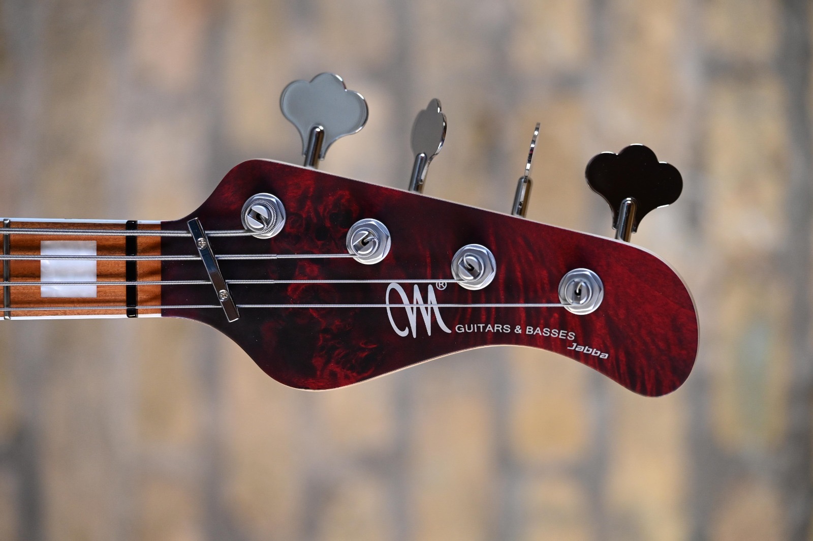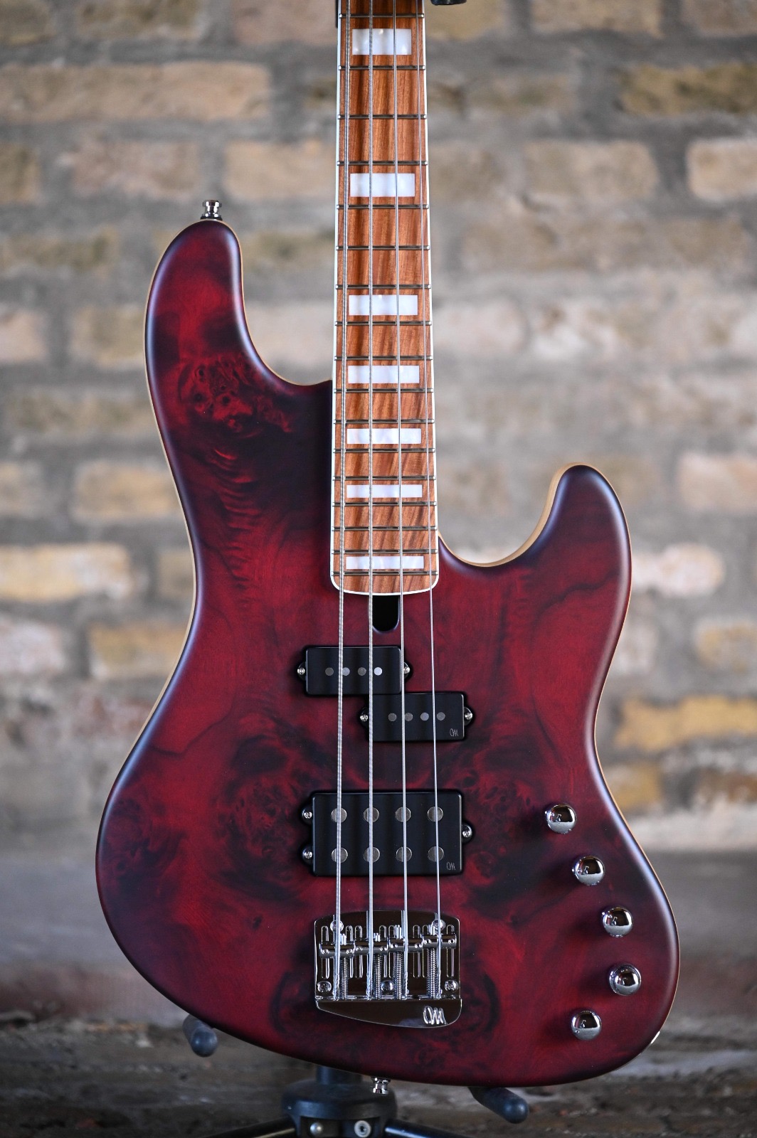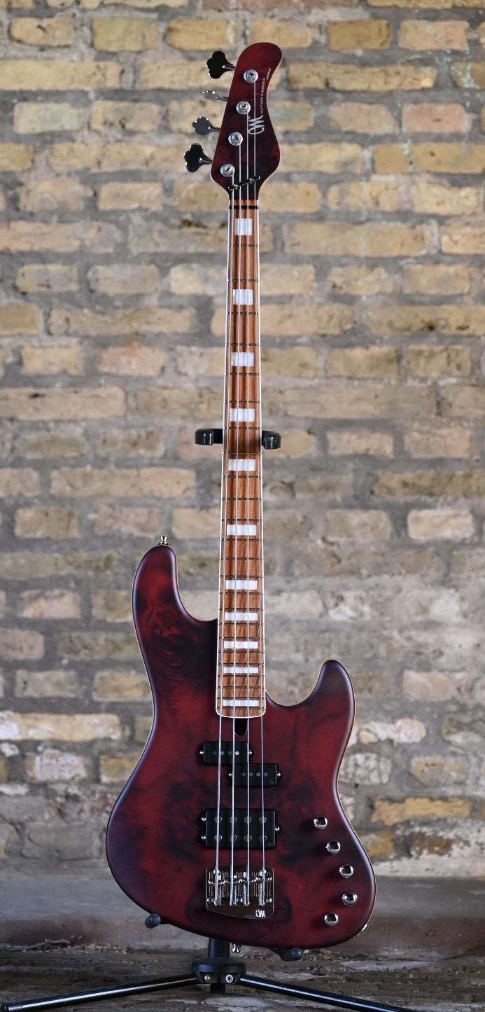 Swamp Ash body, Eye Poplar top, Dirty Red satine finish, custom Mayones Velvetrone pups: Probus 4 (P) and Muscle 4 (MM), Mayones Musashi Nitoryu 3-band preamp and headphone system, Hard Rock Maple 1pc neck with jumbo frets, Pau Ferro fretboard, Mayones Bigfoot Bass Bridge, Hipshot USA UltraLite tuners.