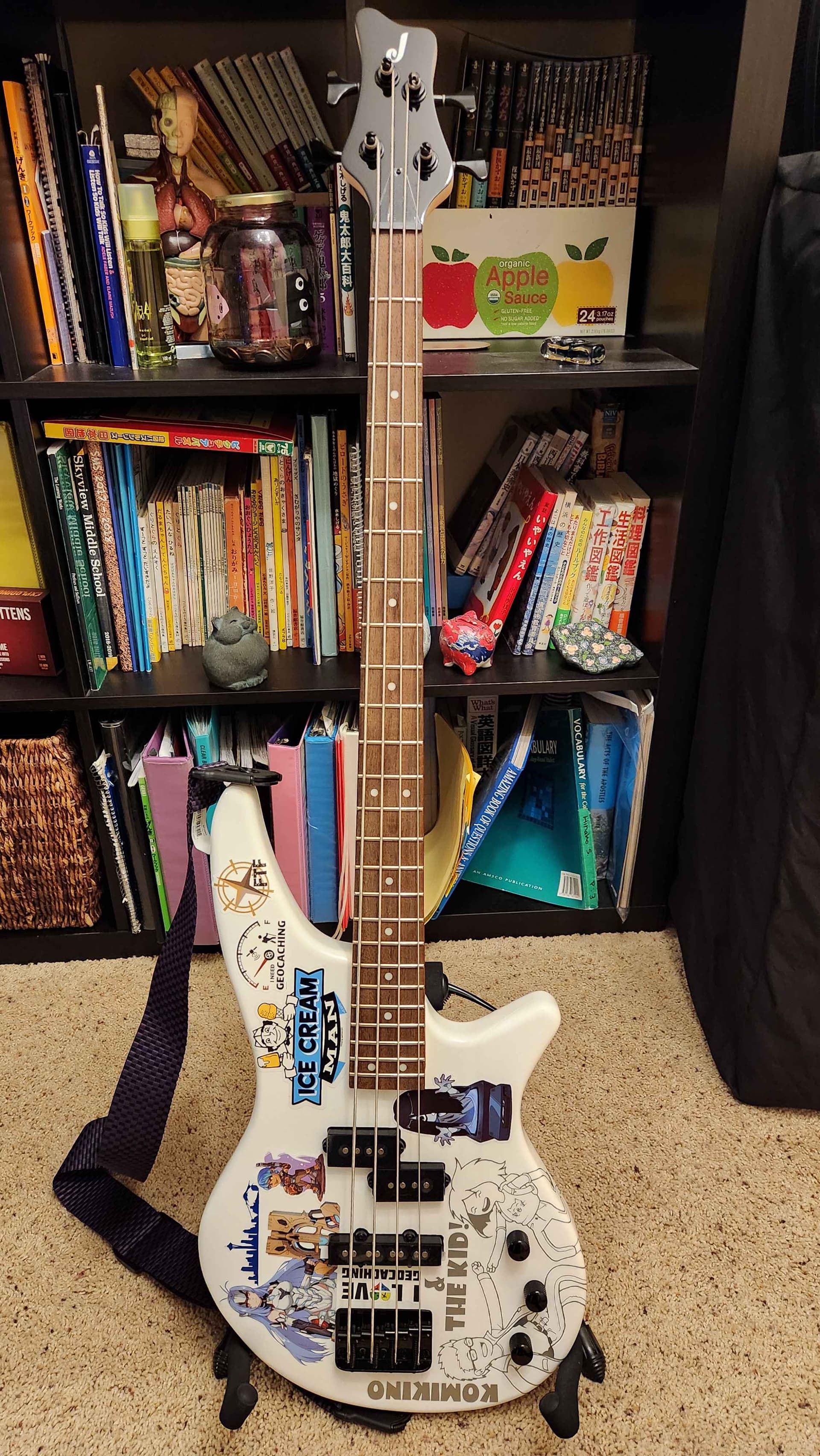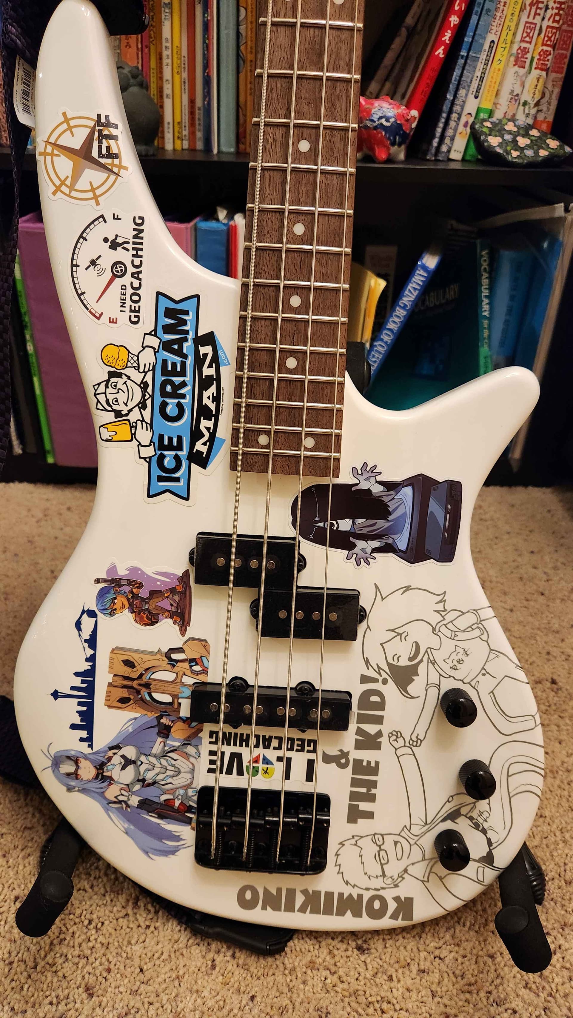 I’ve always wanted to get another bass guitar so I can put stickers all over it. I don’t want to put anymore stickers on my Ibanez and Squire because I love their basic colors and want to leave them as they are. Over Black Friday weekend, I went to Guitar Center and found a basic cheap white Jackson bass. I played it, and it played nice! Sounded great too. Since it’s was a basic flat, white color I figured it would be good for stickers. GC gave me a good discount off of it and I bought it.
