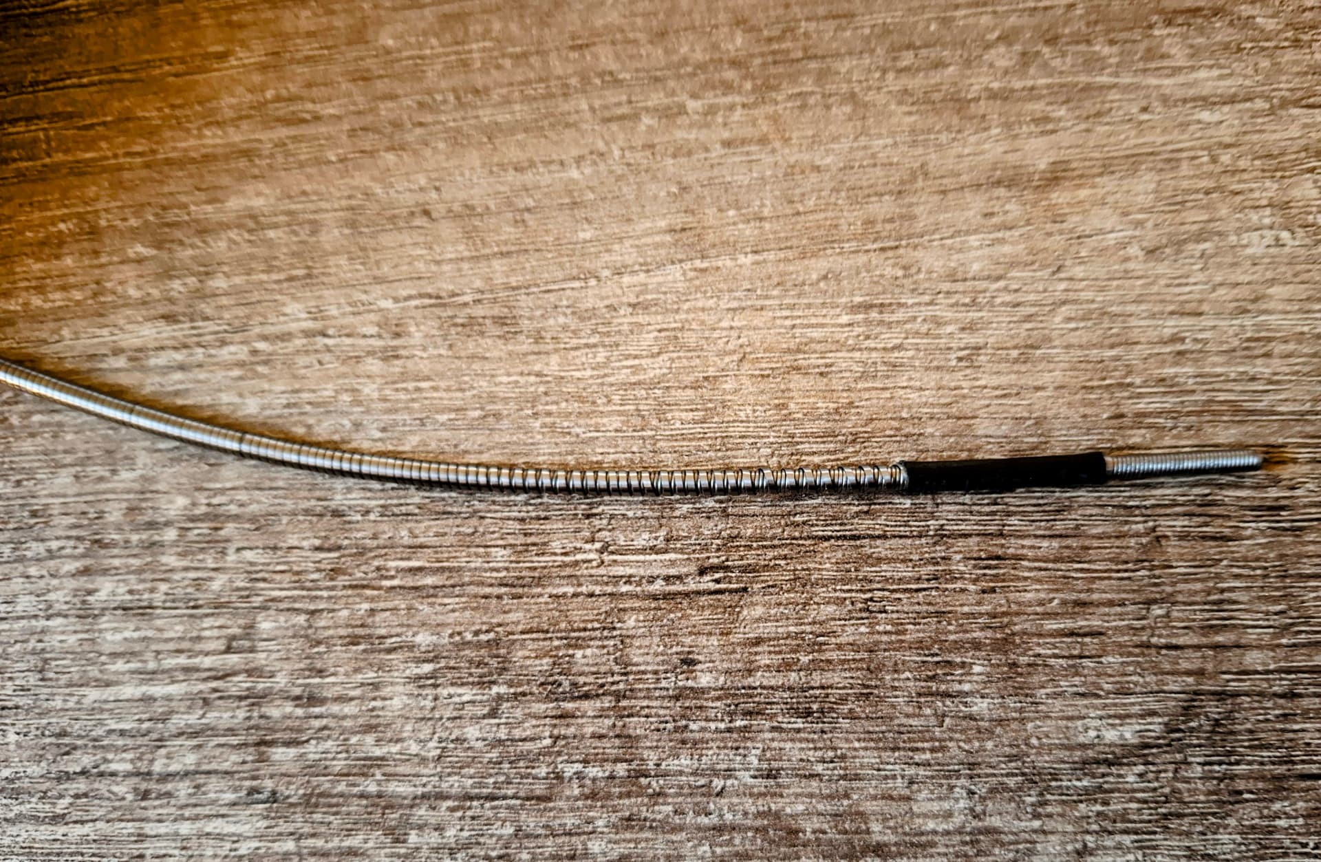 This is my destroyed Dunlop flatwound … look at the middle section, where everything came loose, despite the Heat Shrink Tubing I used to avoid just that