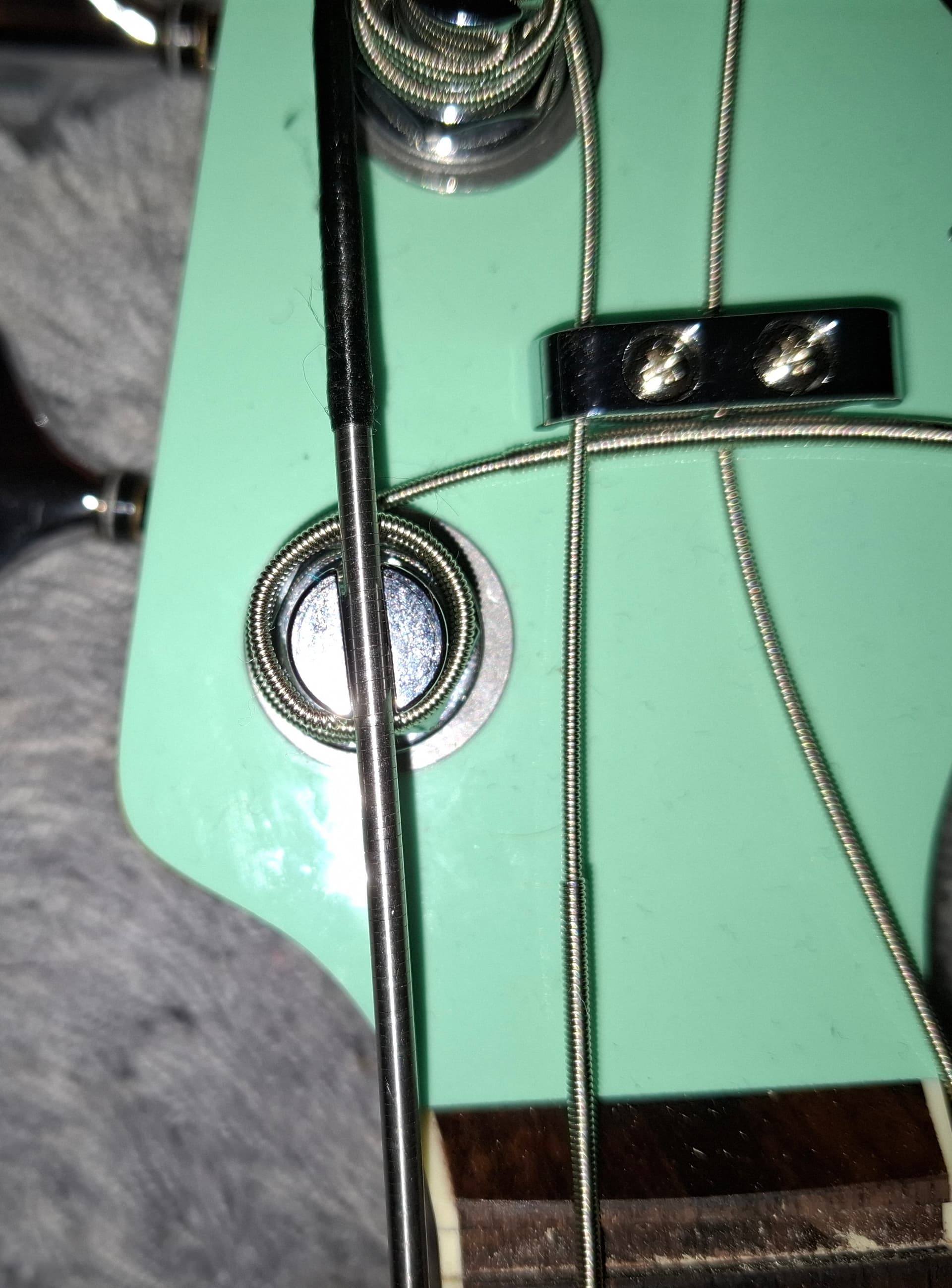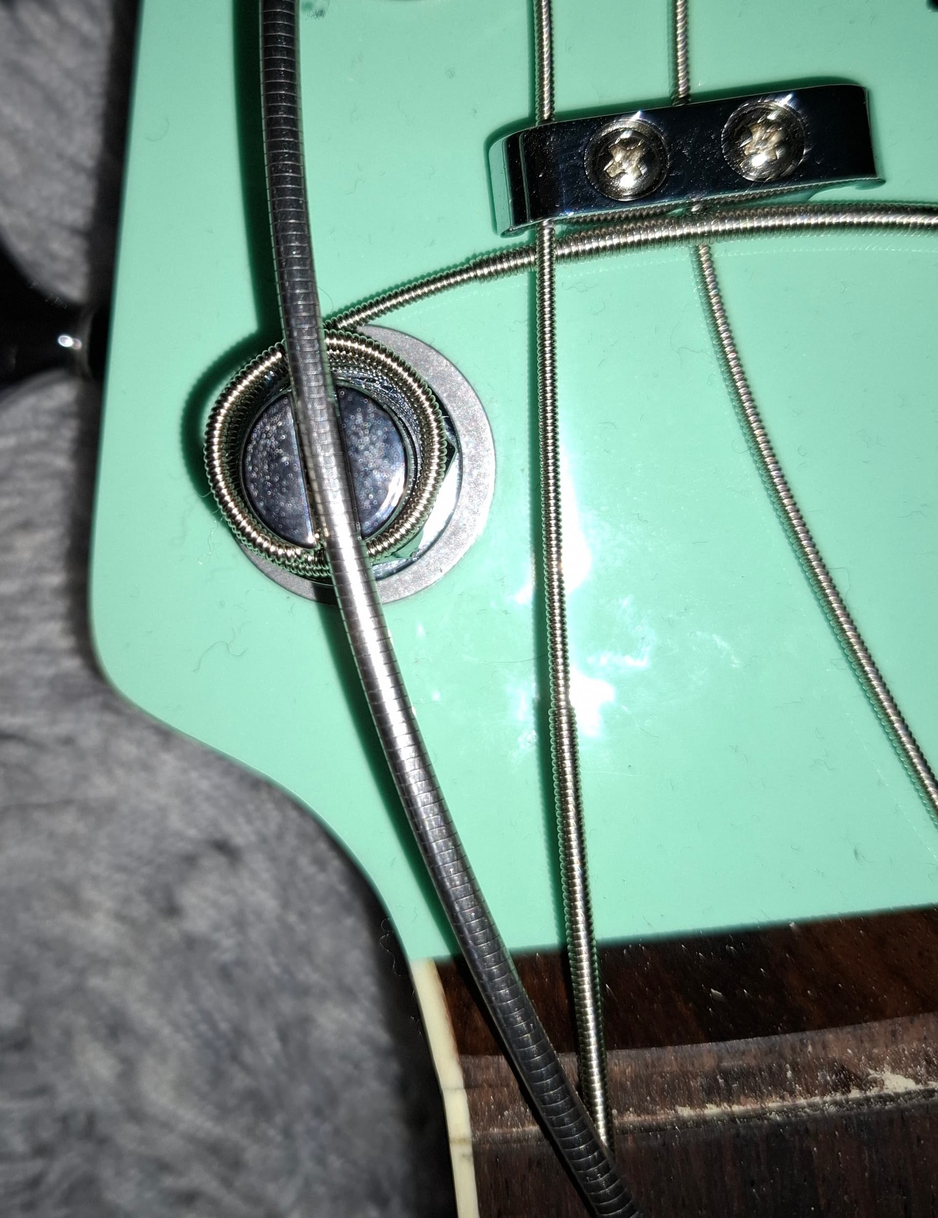 This is a 32" A string on my 30" fretless (ignore the other strings and the missing nut - this bass is being disassembled currently):