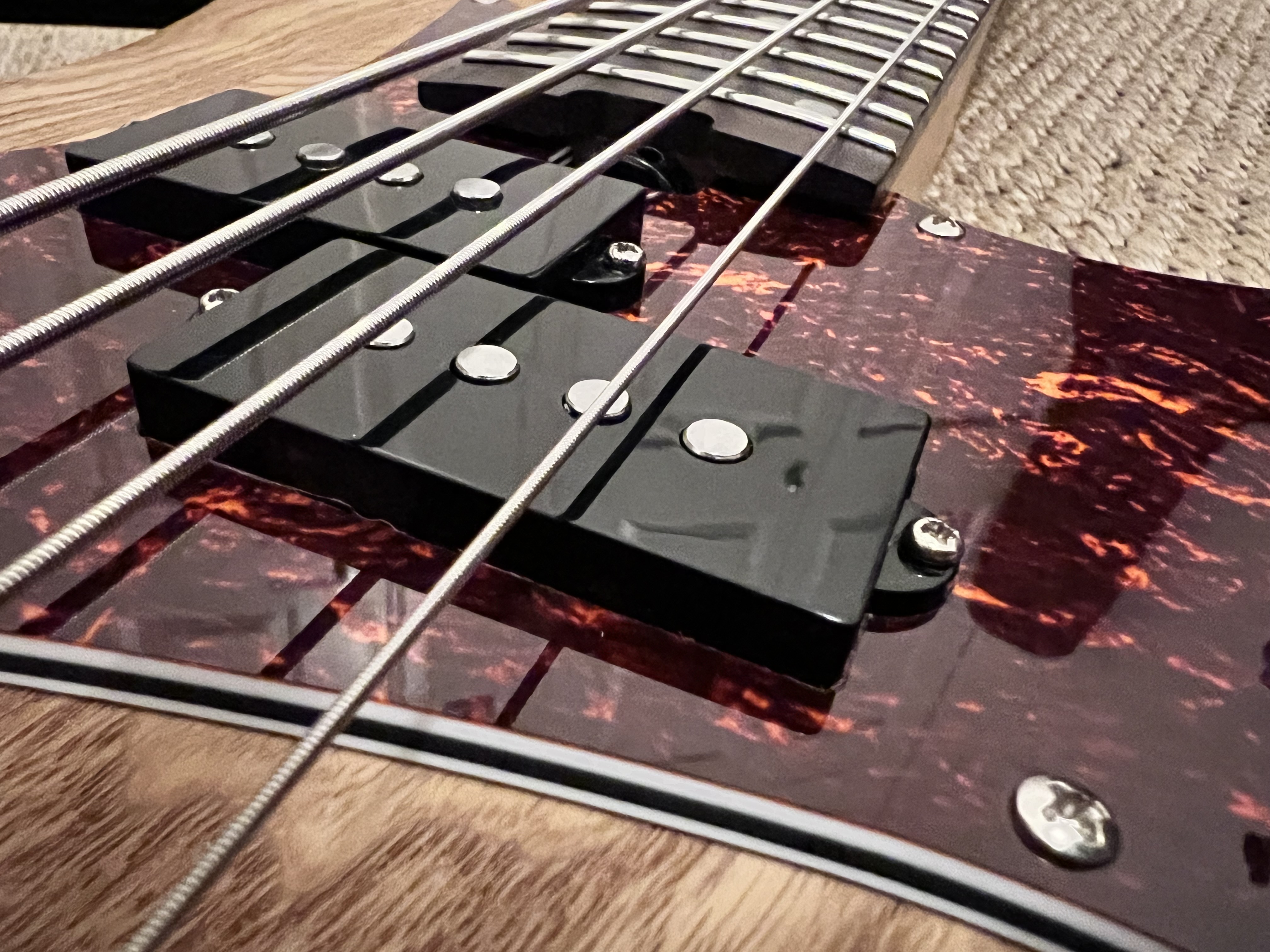 Got the bass back from the guitar tech this evening. It is now playable!! The neck is now flat, the action is good ‘n’ low all along the fretboard, and with rounds on it, it’s far nicer to play. I’m not really a fan of the feel of flats.