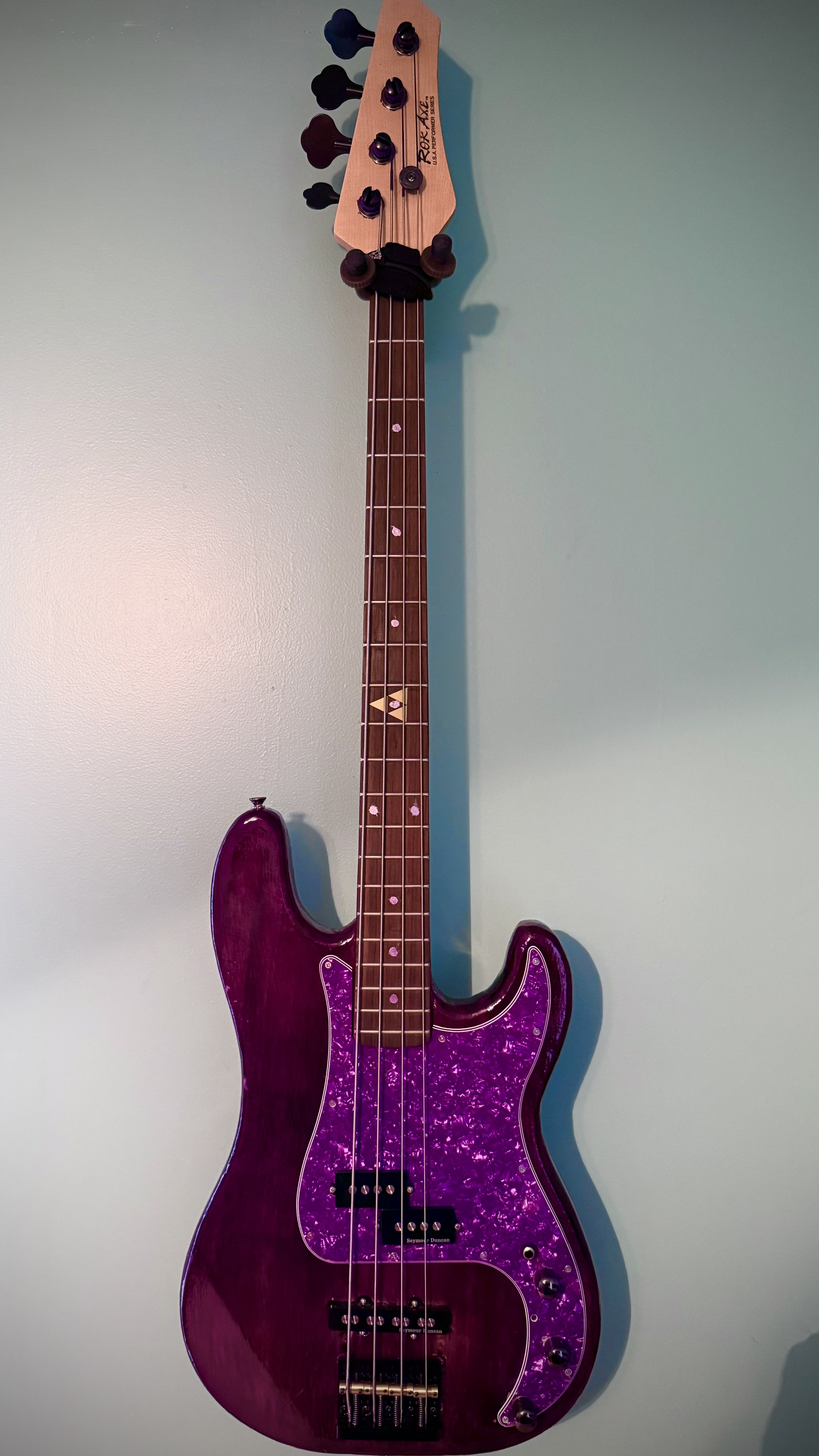 This is purple haze. First bass I ever bought and was in rough shape. I’ve turned it into my learning bass on how to do repairs. I removed the puke green paint, stained her purple, new hipshot tuners, new nut, new bridge, new 1/4 pound Seymour Duncan pick ups, with ghs flatwounds.
