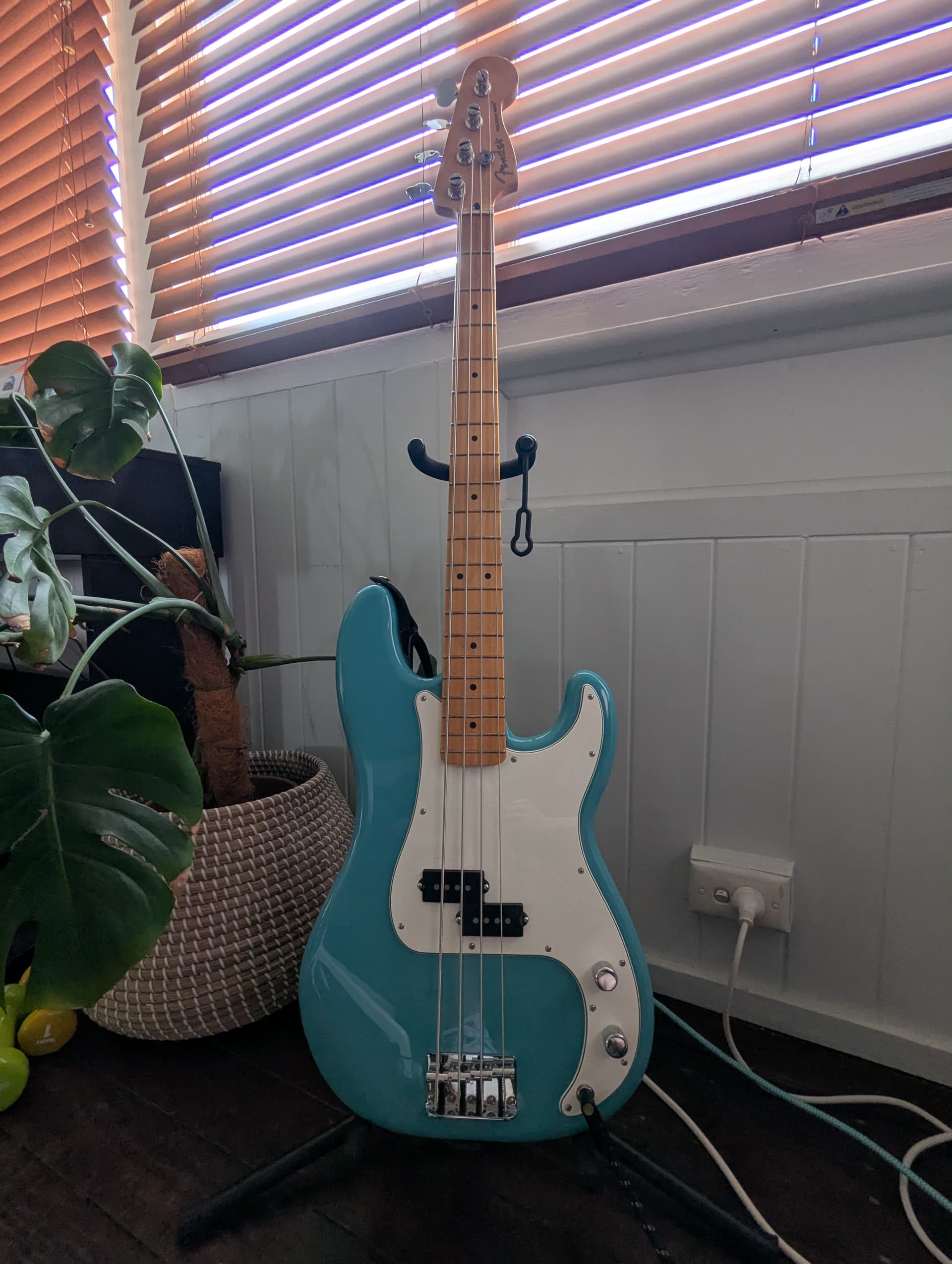 I thought a second bass would be wise now that I’ve joined a band. I already owned an active Fender Modern Jazz MIJ so i thought a good old P Bass would be the logical choice. One of the local shops had a Player 2 Aquatone Blue model in stock. I played it, I bought it, I love it.