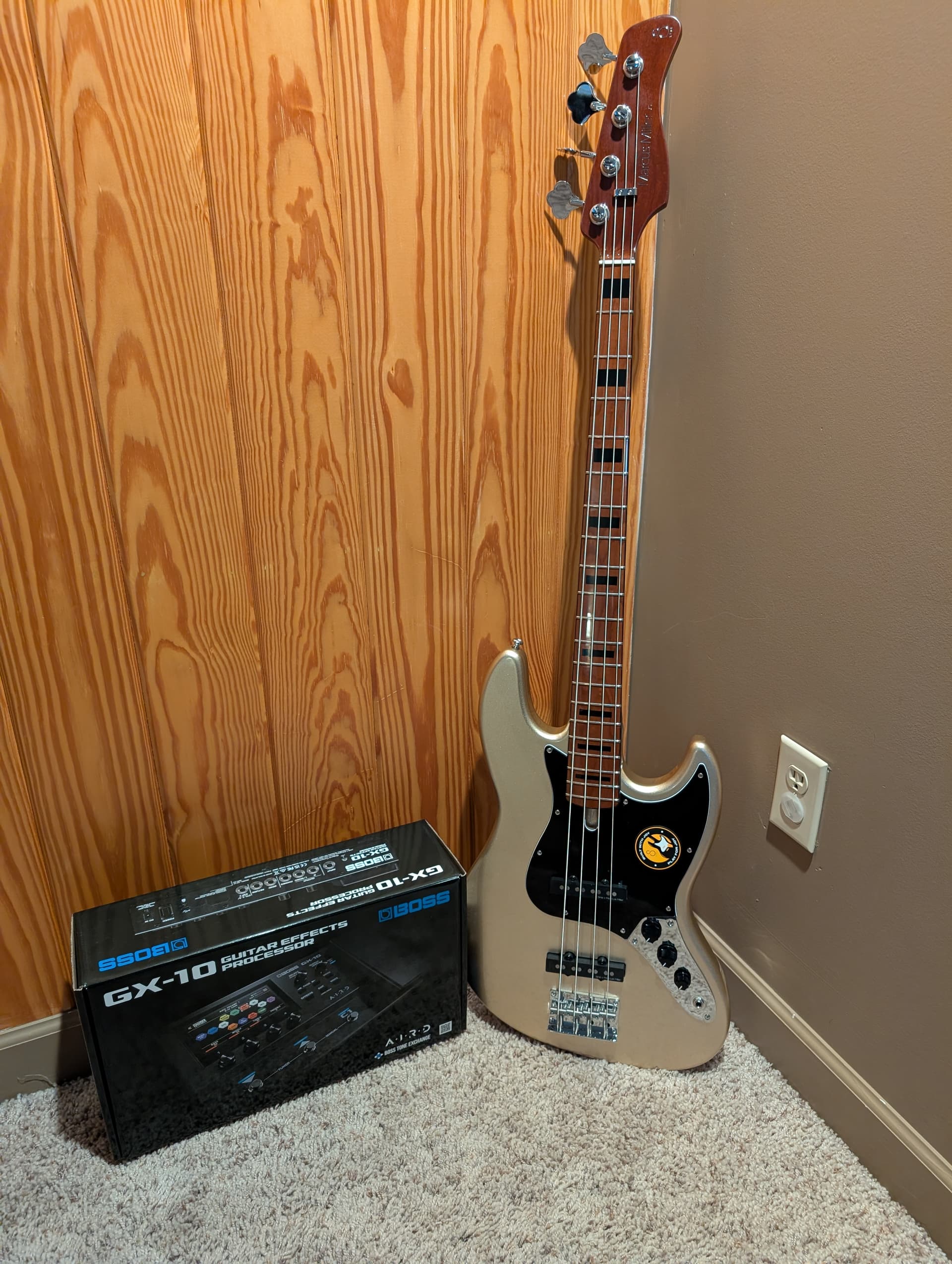 New Gear Day - Sire V5 in Champagne Gold Metallic and a Boss GX-10. I actually had a GX-10 when they first came out but I returned it to try something else, regretted it, and picked another one up to keep for good.