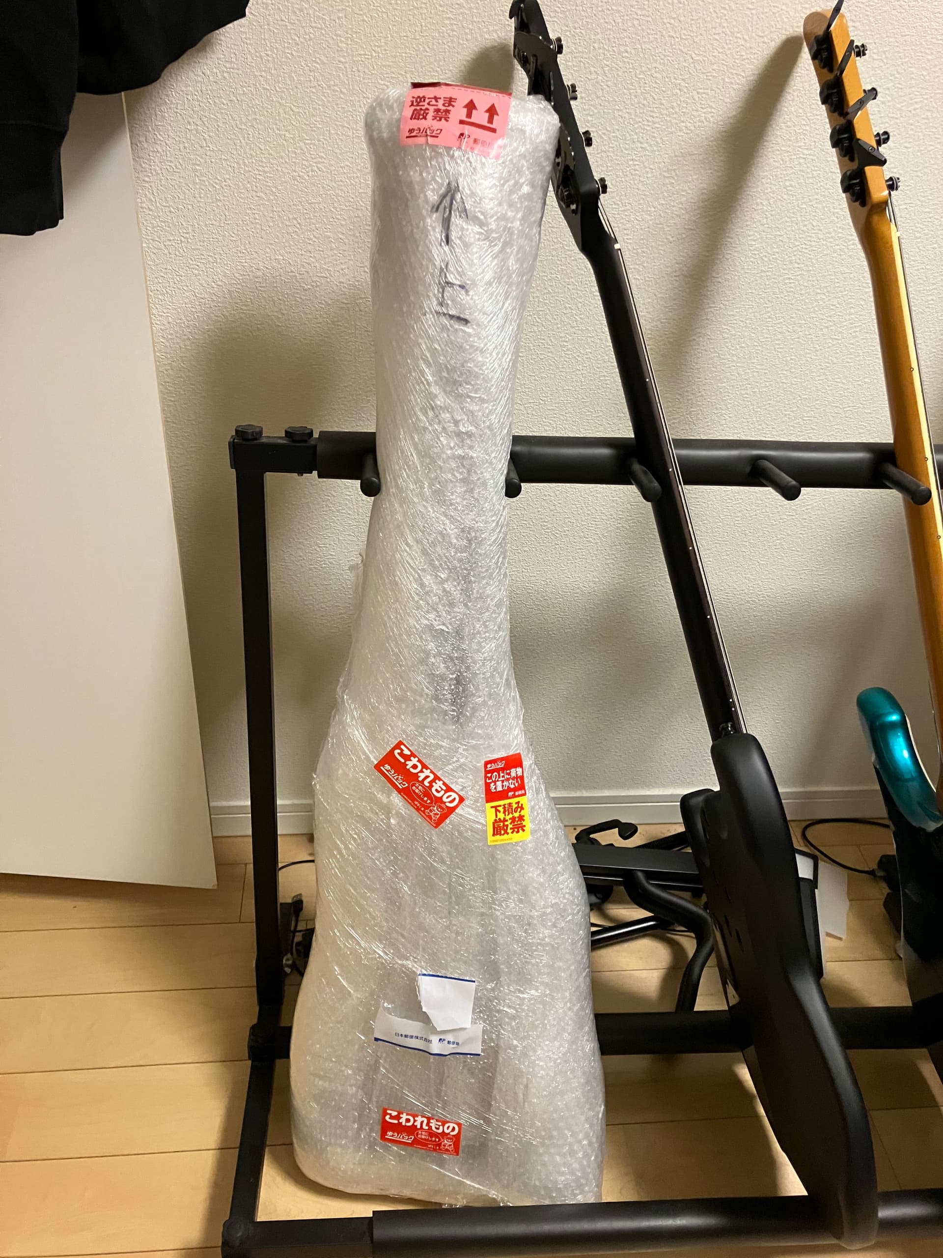 Here’s something you probably don’t see every day in the US: a bass shipped wrapped only in bubble wrap, without even a gig bag around it, much less cardboard: