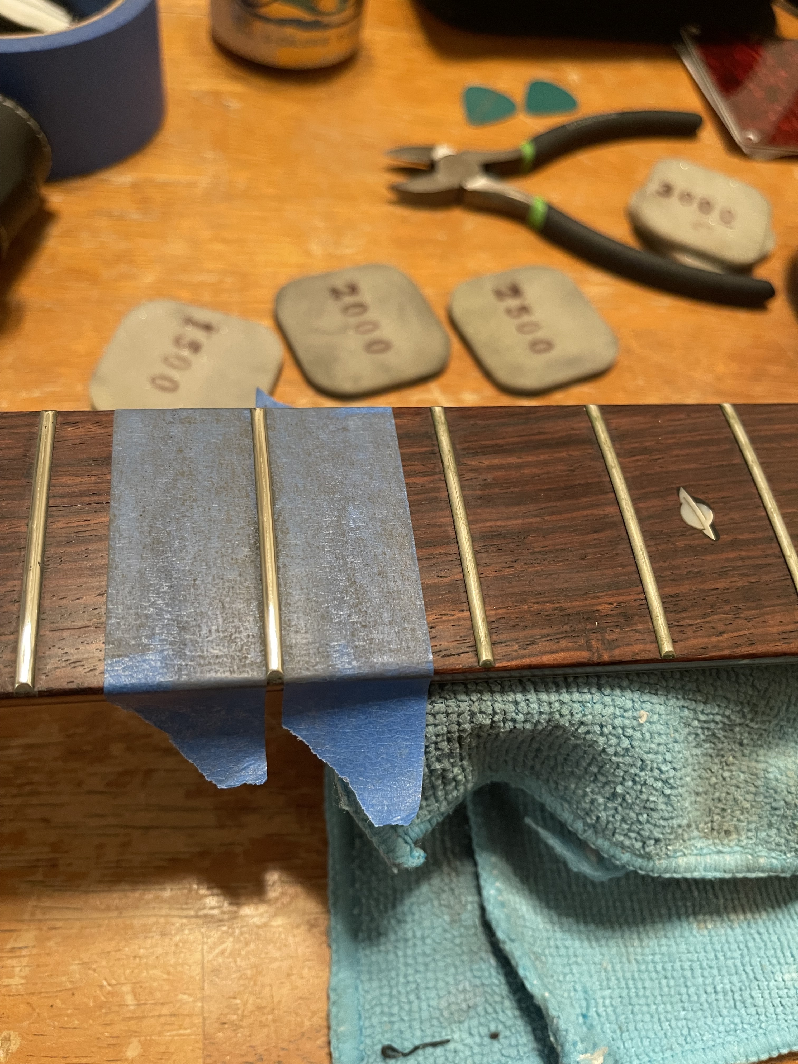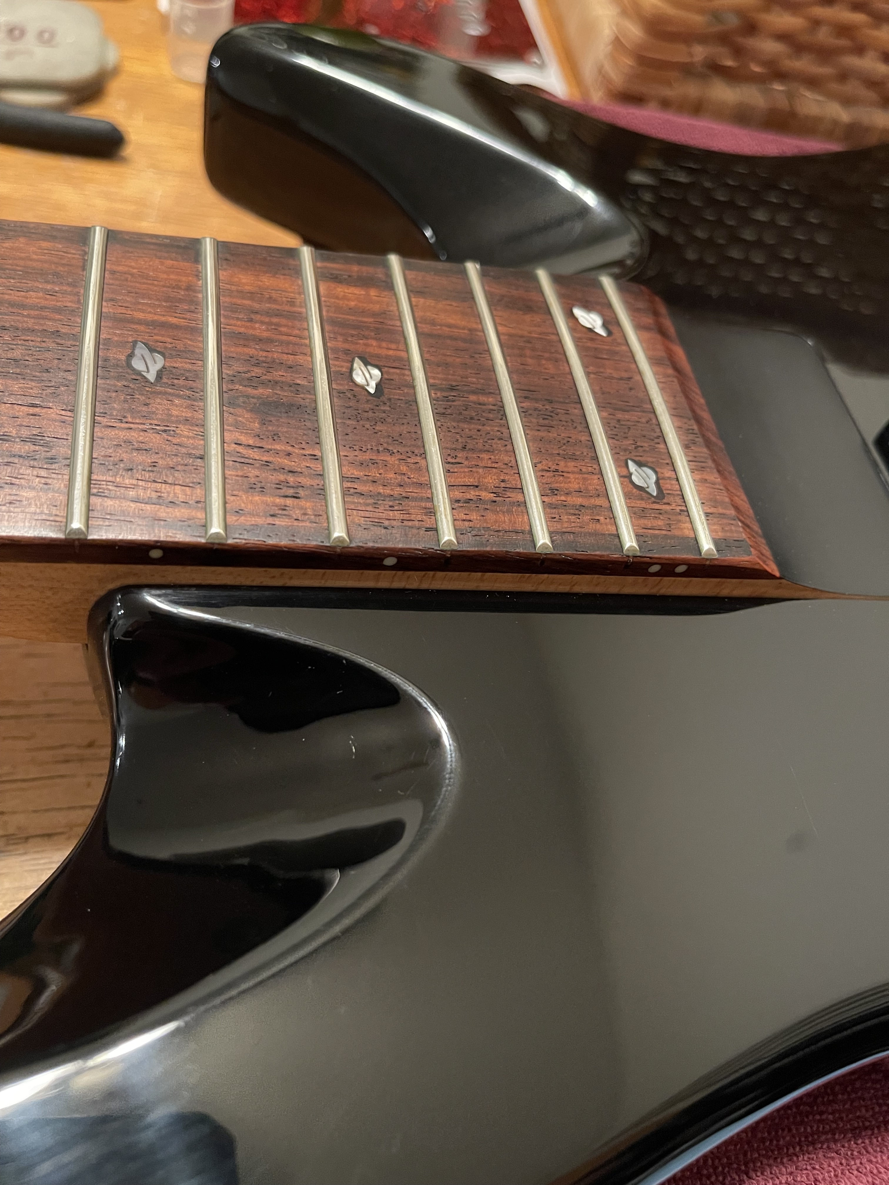 The fretboard in particular is gorgeous. Pickups both sound great and electronics are fine (before I ripped the gunky strings off anyway). Tuners feel great and the bridge seems fine and looks like a new Gotoh to me.
