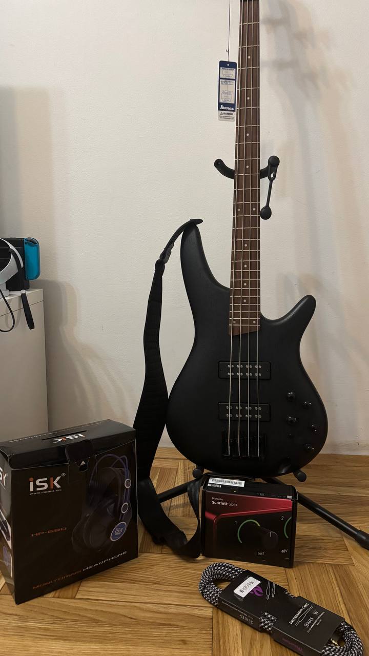 I decided to return to bass after a 12-year hiatus. I wasn’t a complete beginner, but I struggled with fundamental technique and was always causing problems for the band during gigs and recording sessions (flying fingers, imperfect plucking and so on). So I decided to start from scratch and pick up an inexpensive and comfortable Ibanez SR300E (I used to play a Dean 5-string). I liked the look of it, and I’m very pleased with its low weight and thin, comfortable neck - really good for long practice sessions. The sound is also decent, although I had to adjust the neck and bridge (I did it for the first time in my life and I’m very proud of myself ). I also decided against a combo amp because I move often, and instead bought a Focusrite Scarlett Solo audio interface – I’m very happy with it.