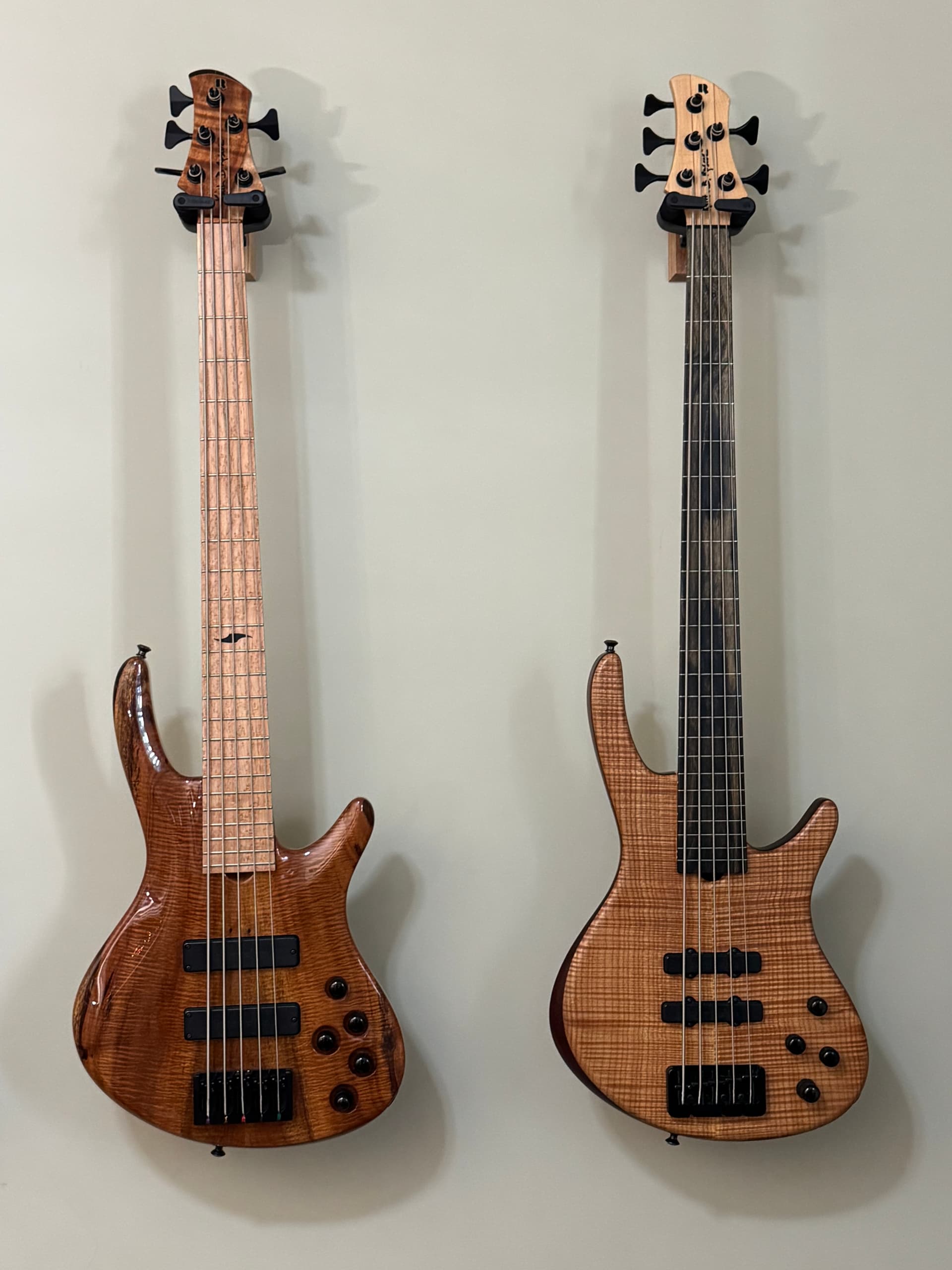 The fretted bass on the left has a flamed koa top and matching front/back headstock over a swamp ash body. Wenge neck with maple runners. Bird’s eye maple fretboard. Roscoe custom Bartolini quad coils, Bartolini pre-amp, and a Sadowsky VTC. It’s a Signature model and has the carved top.