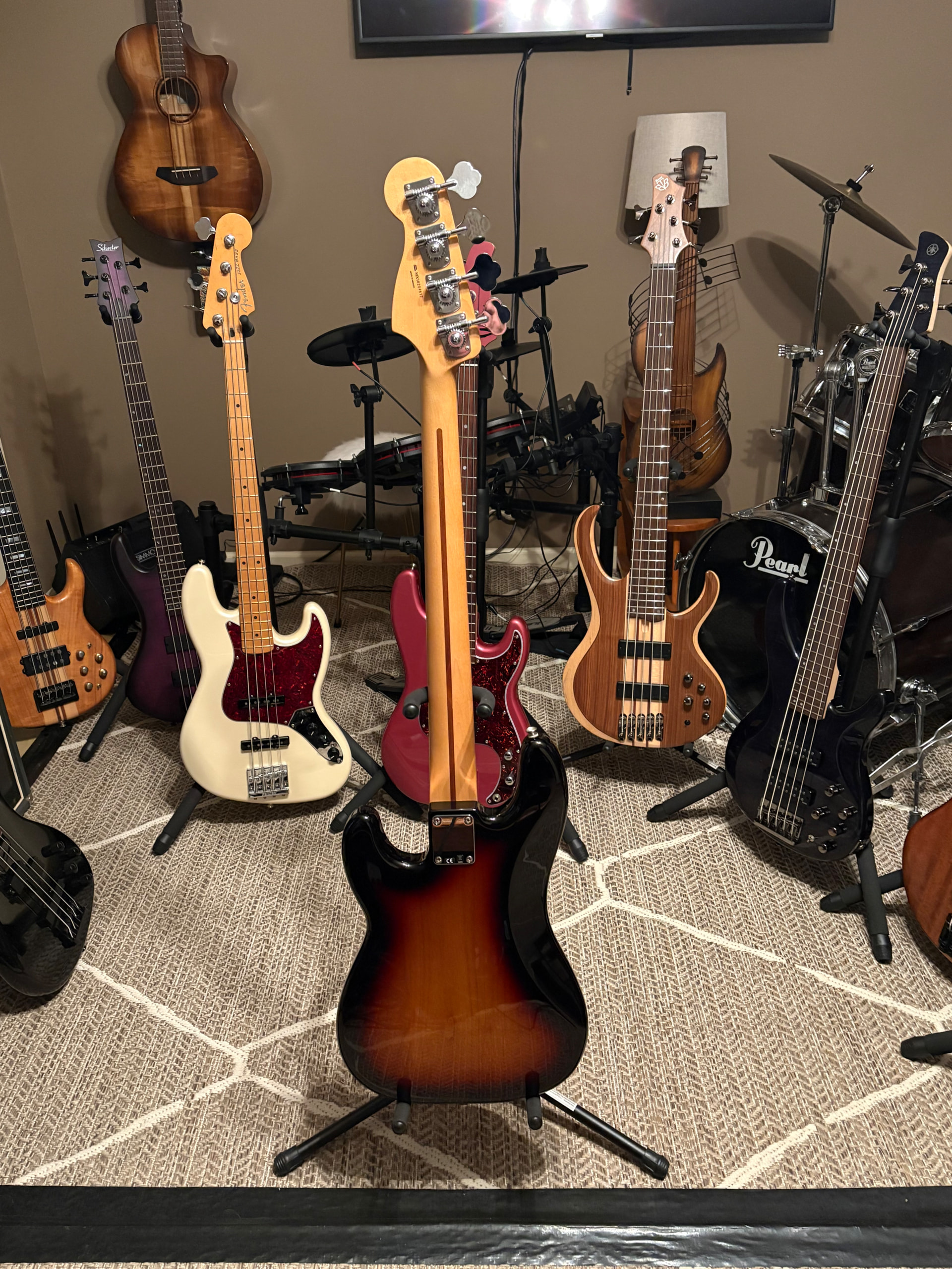 Let’s see if I can get this to look right. I am doing the bass lessons, but I’ve been playing trying to learn for a little while now. I have a talent for woodworking also. This bass is my first attempt at building a bass. I built the neck and the body on this one. All the others I built I used Warmoth necks on. Necks are a bit more challenging, and Warmoth makes some real good ones. The finish on this one is not that great, so it is my Frankenstein bass. I use it to experiment with. I’ve already had 3 bridges on it. It plays real nice. Seymour Duncan pickups, EMG pots and wiring kit. Hipshot bridge, Graph Tech Ratio machine head tuners. This one has no electronics in it, just passive sound. Neck is curly maple, body is mahogany, finish is lacquer. Finish not that great on it cause I could not get it to dry well enough, so I did not use lacquer on any others.