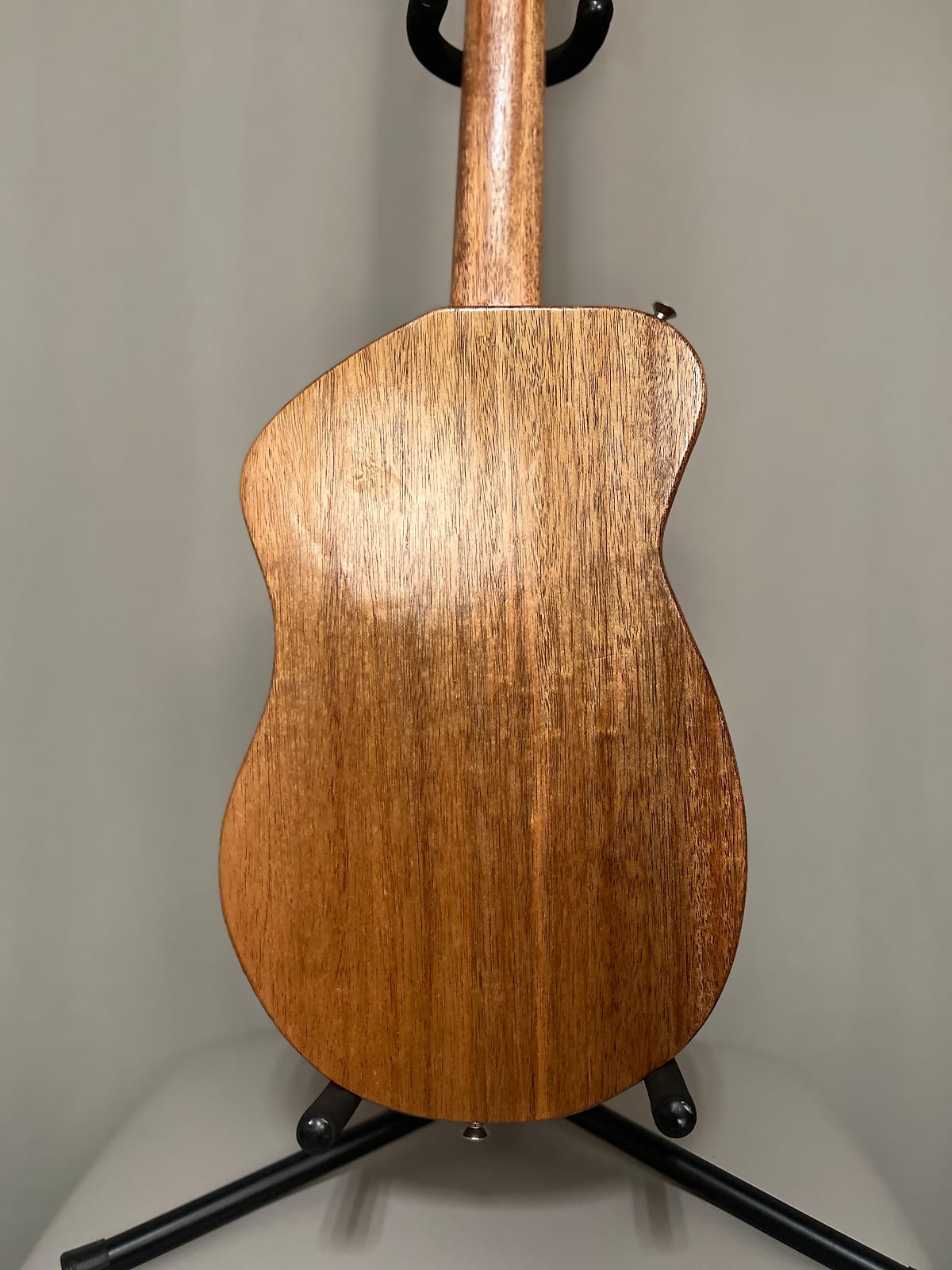 The neck is mahogany as well with a purple heart fretboard. Inlays and side dots are turquoise, because his wife is new agey and believes turquoise brings positive energy.