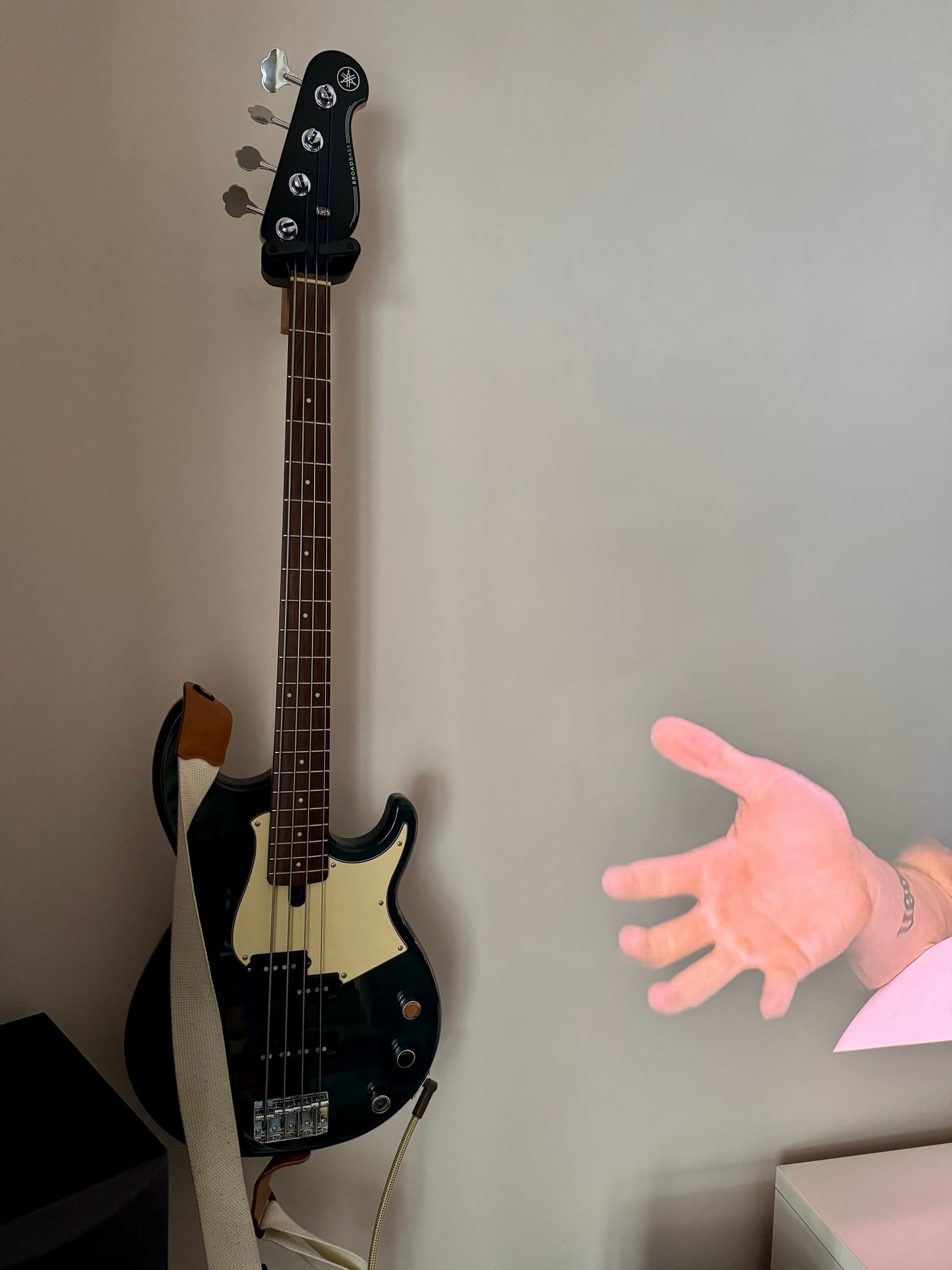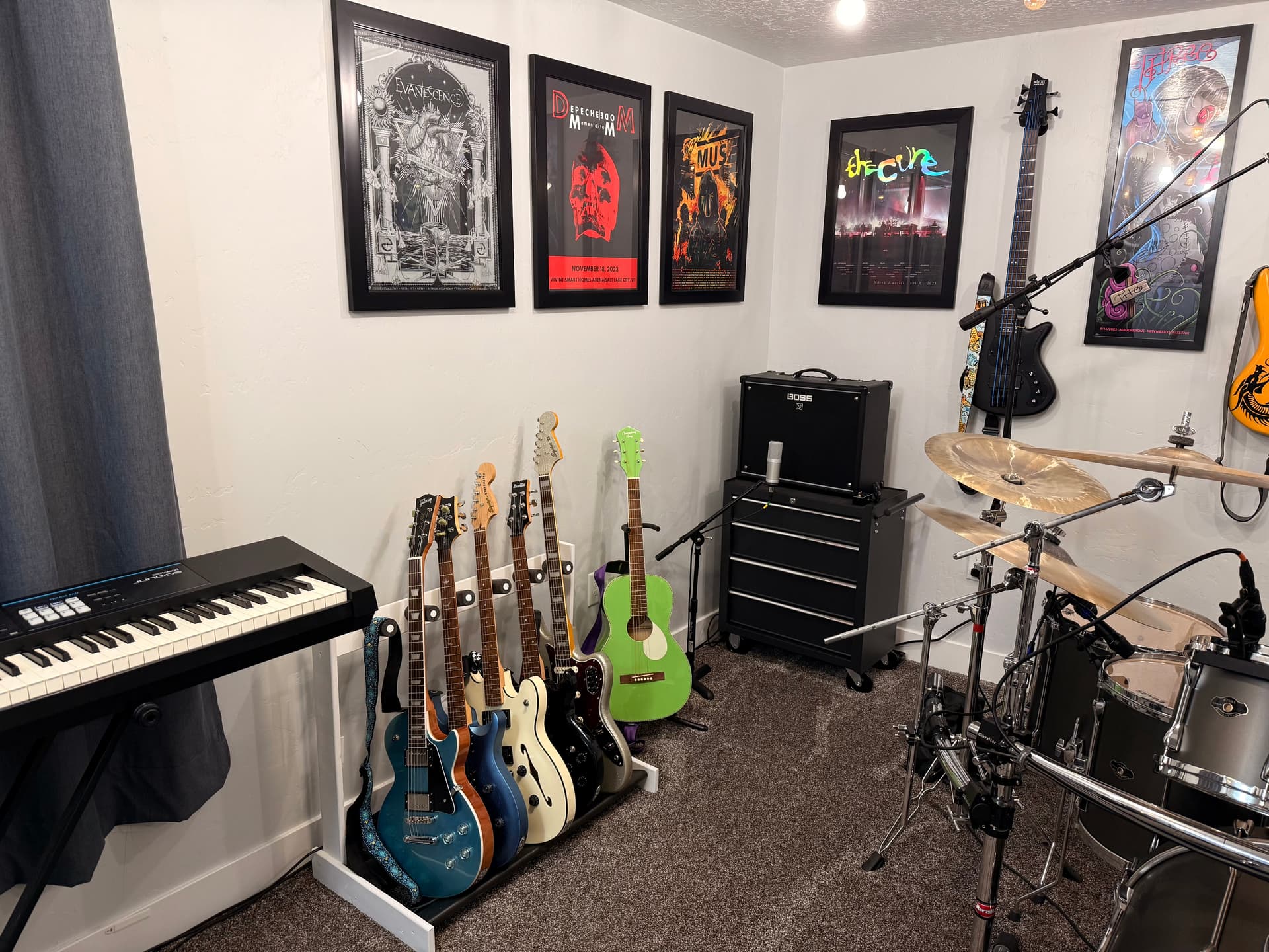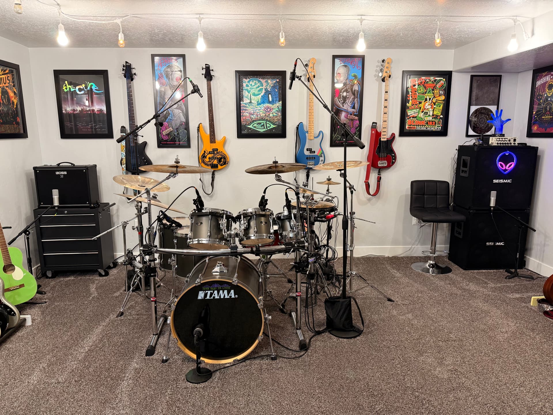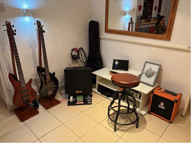 I have rearranged some things, added some guitars and amps, sold some basses. I still need to clean up the wall on the other side of the camera. One of my favorite new things is using the tool box as an amp stand. I have so much more storage space!