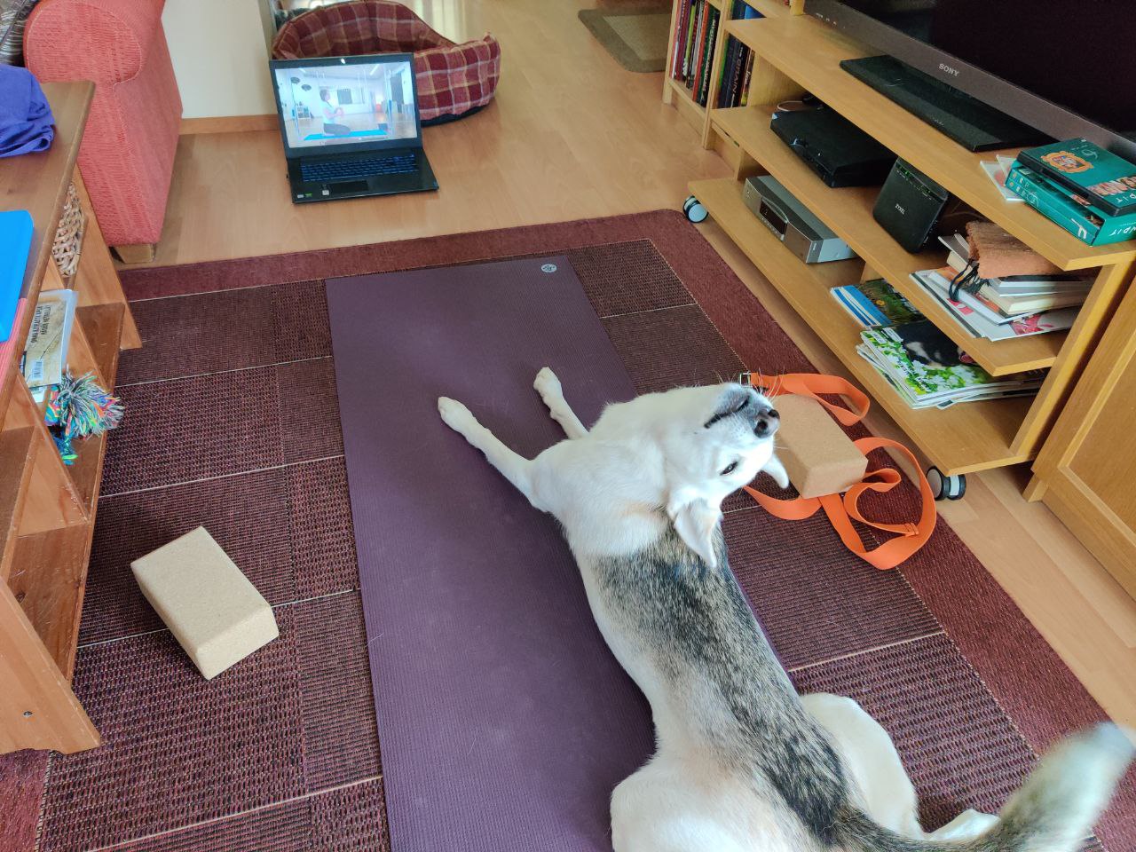 Here I was doing my stretches and got up for a moment, so Hilde took the opportunity to get onto the yoga mat to prove she can stretch a lot better than me:
