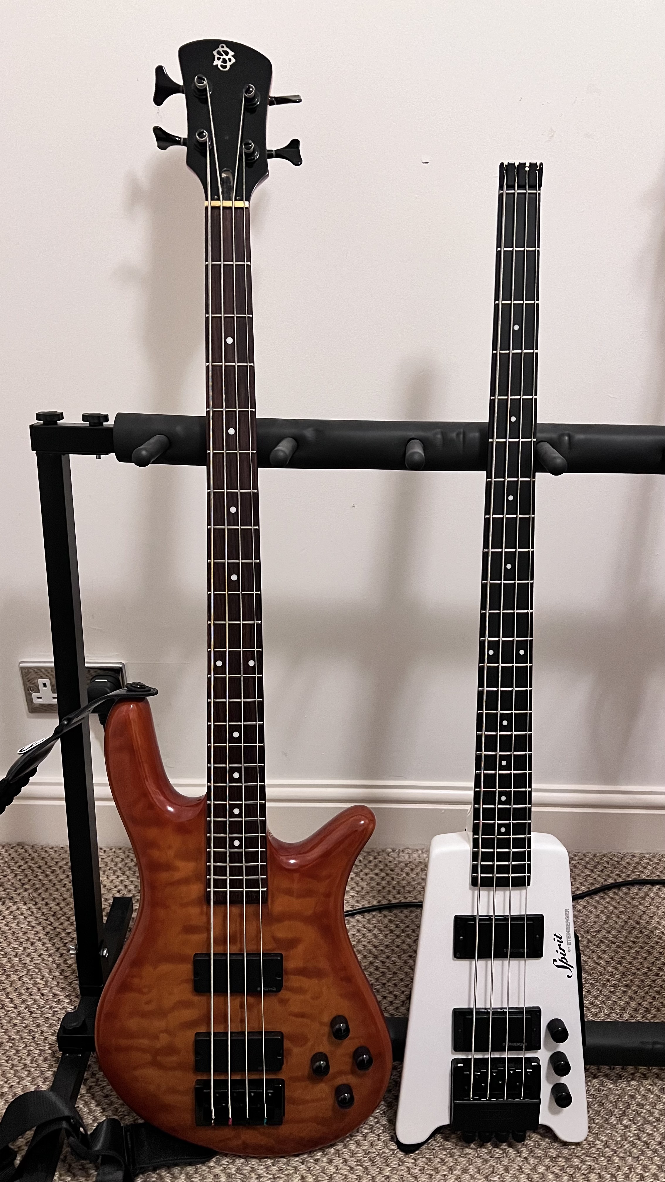 Here are mine. The Spector is an NS2000/4, manufactured sometime between 1999 and 2003. This thing ROCKS! The Steinberger is a contemporary iteration of the classic 80s model. It’s also great to play!