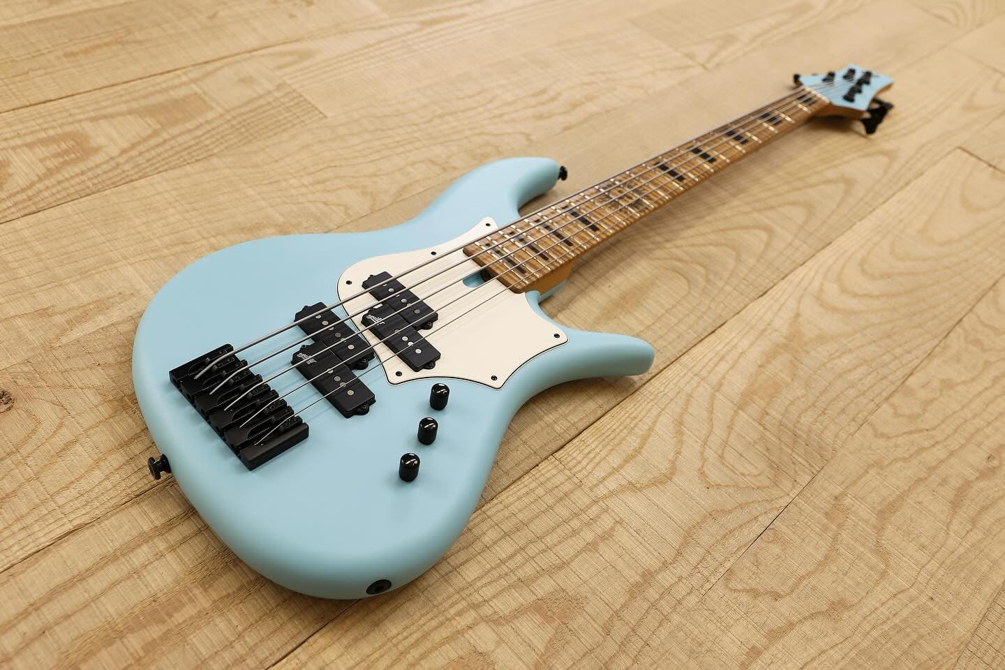 The SP1 is passive, so there are no batteries or EQ boost, but the quality of the tonewoods, alnico-loaded pickups, and the overall construction mean that there’s absolutely no need for them. The front control is volume, and the back is a master tone. Between these is our Quad-Tone Pickup Selector. In its first position, fully clockwise, this selects the front pickup alone; one click clockwise is the front plus the back pickup in series, then in parallel; and finally, the back pickup on its own.