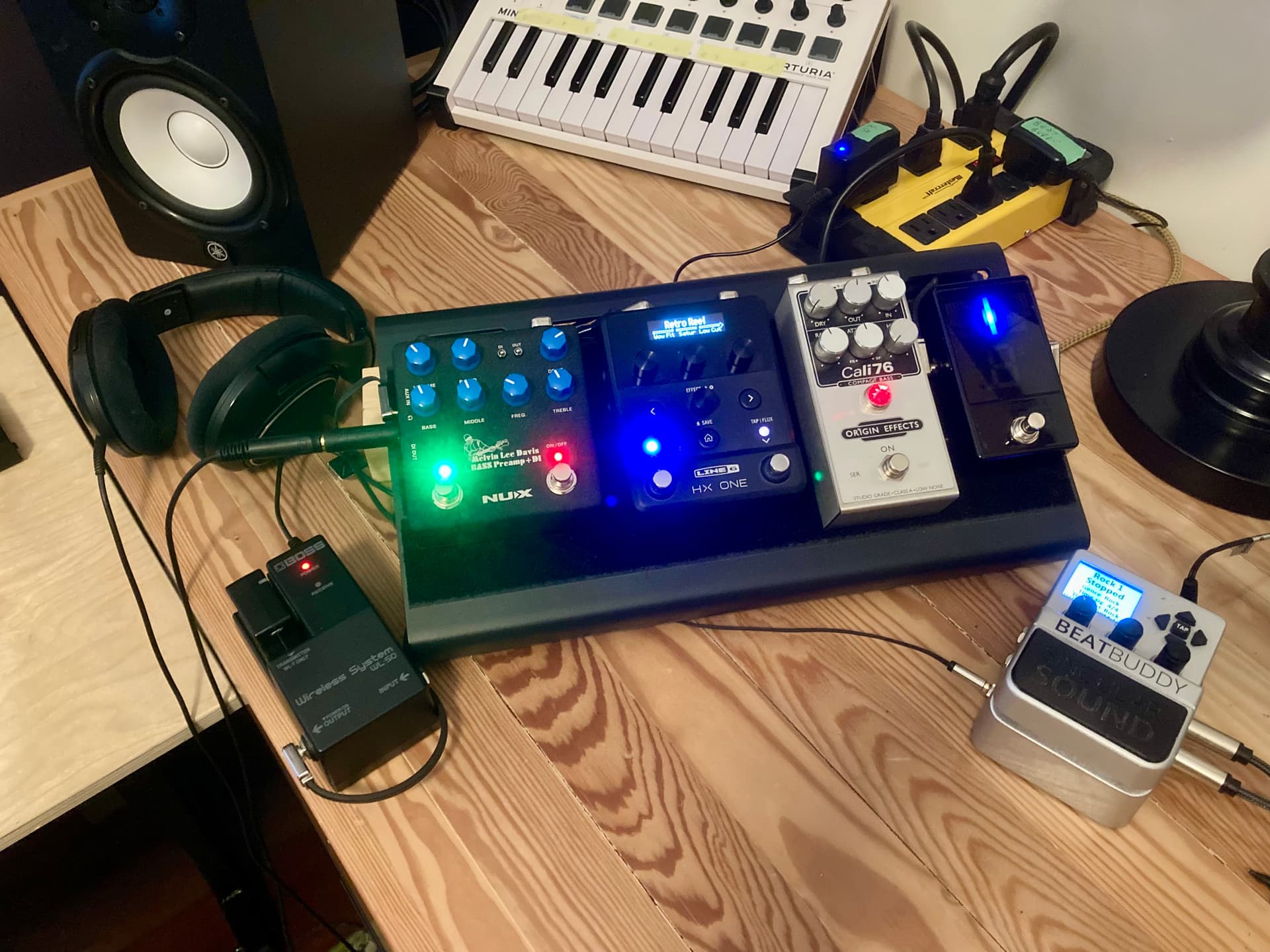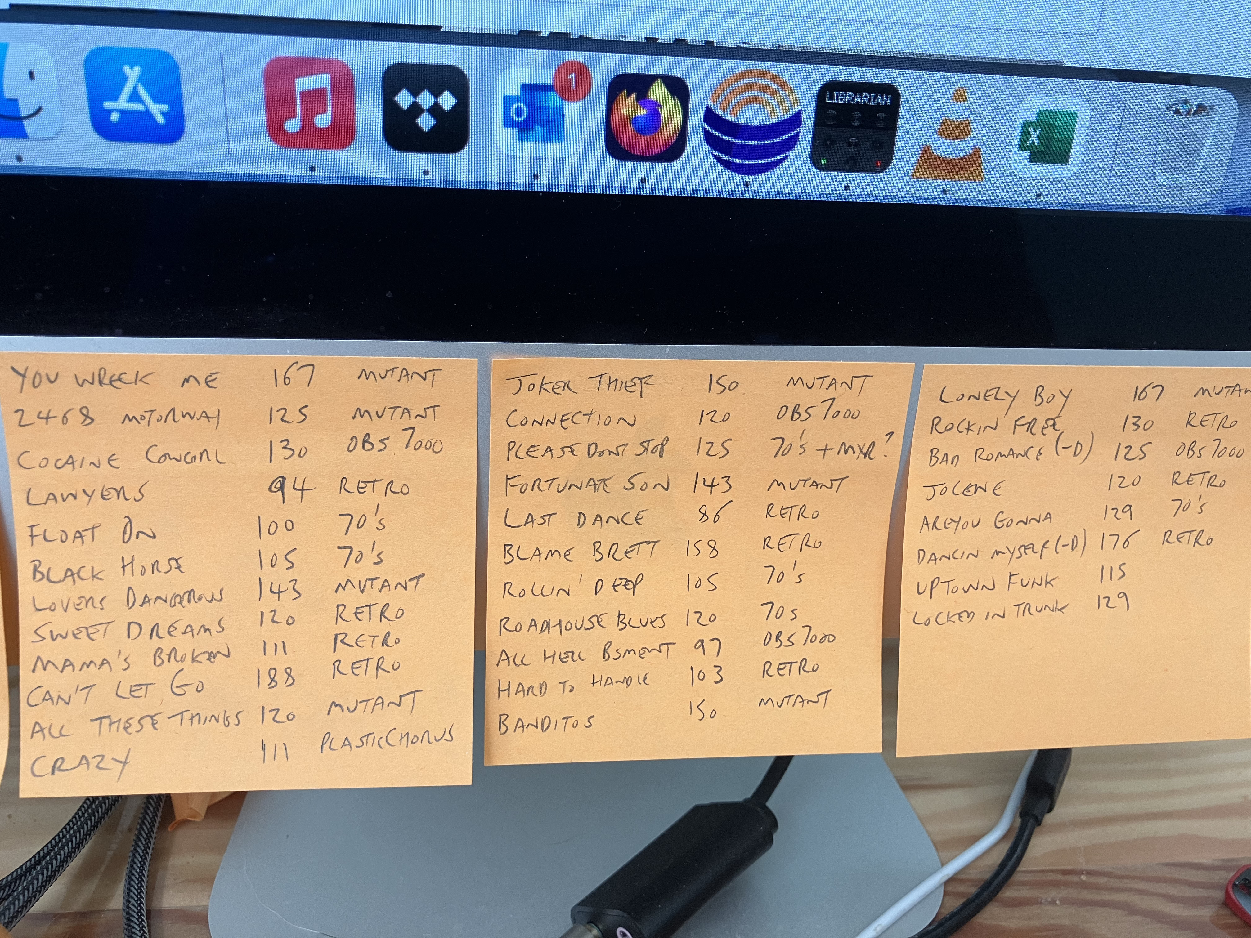 Here’s our band’s current set list @maarten and my low tech solution. Plug in my bass, dial in the tempo for the song i.e. Blame Brett @158bpm, press start on the pedal and go. Less than 30 seconds and I’m practicing.