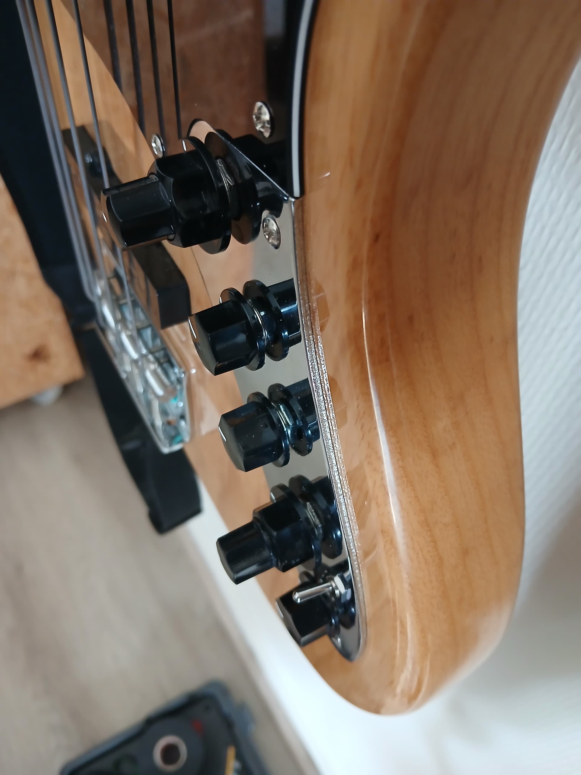 The previous owner that installed the pickups also pulled out the EQ, removing the pots and knobs and plugging the holes they left behind. So I installed a Darkglass Tone Capsule. It was so incredibly easy to install, but probably because I left it wired as two volumes. In a future project I’ll rewire it as volume/blend and also wire in a bypass switch.