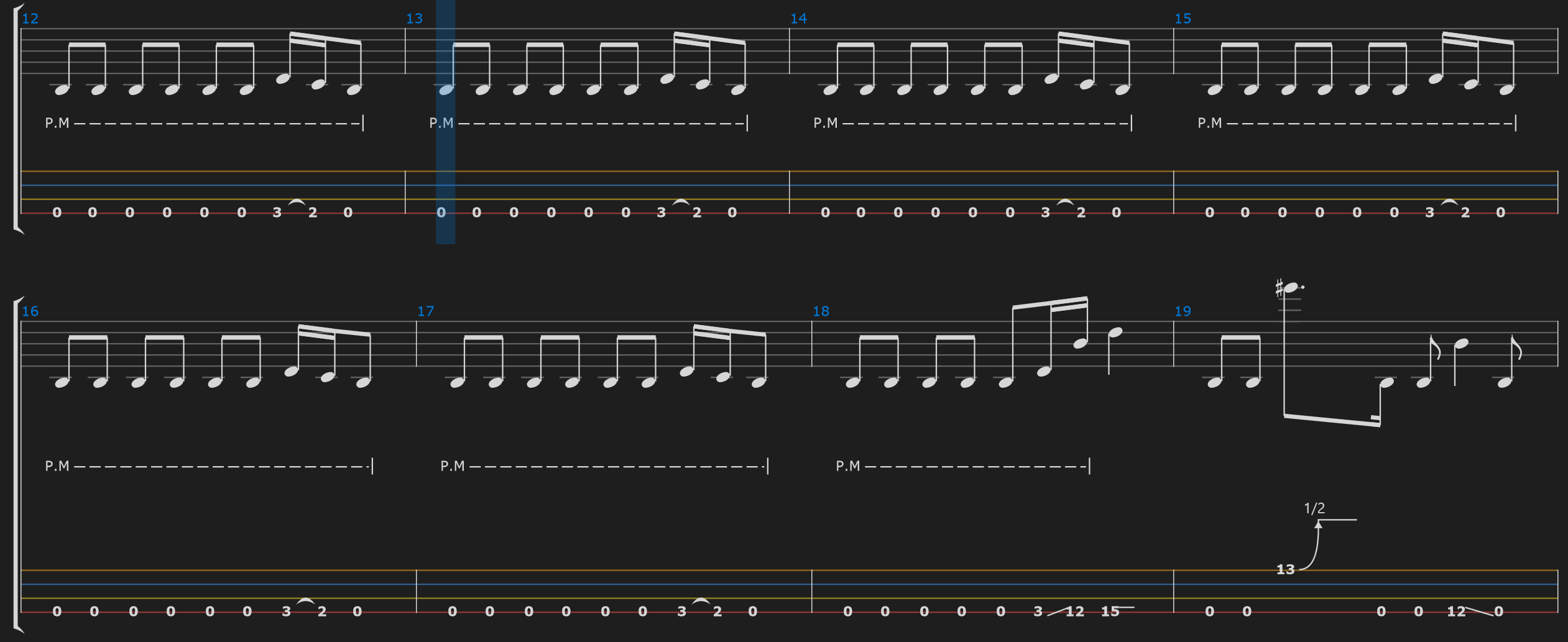 Except for sliding, I struggle with palm mutes WHILE playing a note (that is what P.M. means, right?), for example: