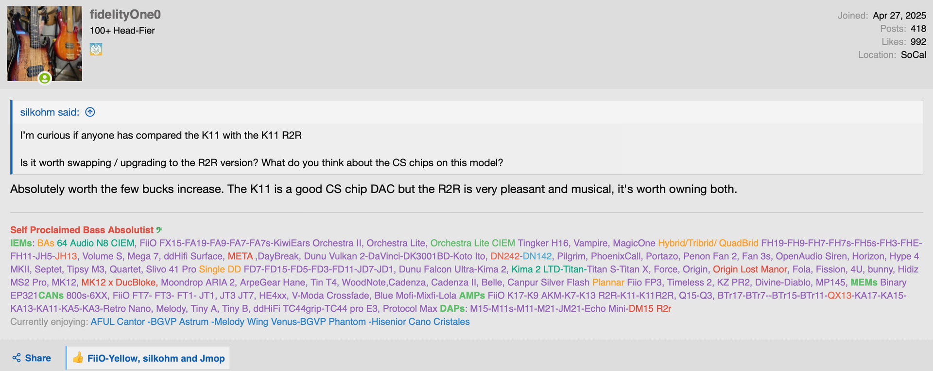 Here’s my account at HeadFi, if you see the brands and models you recognize and have questions please let me know. I’ll do the comparison and give you the lowdown on the set you have your eye on.