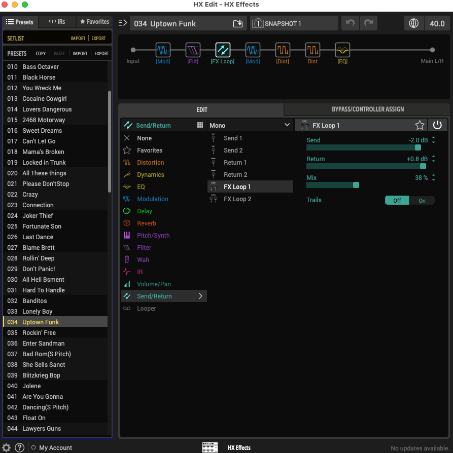 Set list in HX Edit for our next gig in a few weeks.