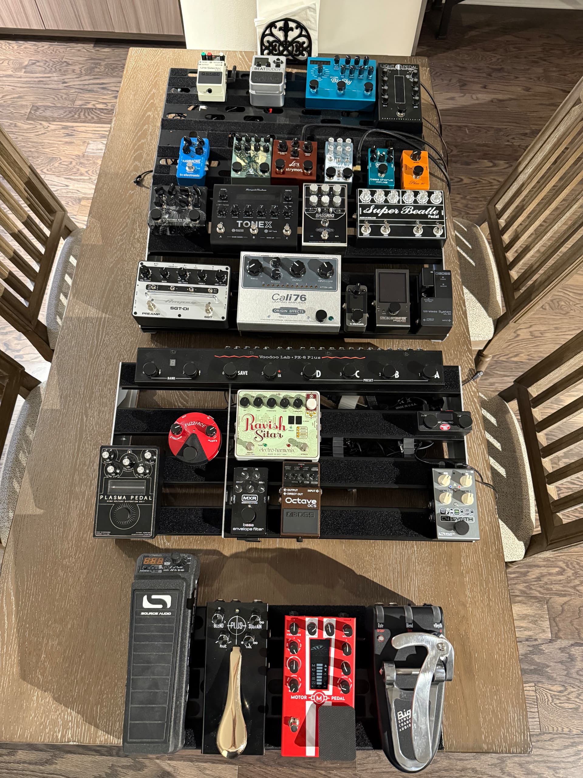 The PX-8 allows me to section off the various effects areas to keep the chain short when effects in a section are not needed, and secction off each individual preamp, since I only use one at a time, to ensure I don’t double up and go gain crazy by accident. The Reflex, Motor, Bigsby and Plus pedals need to go on the floor, so a small board will still exist down there, as they are ‘foot forward’ pedals.
