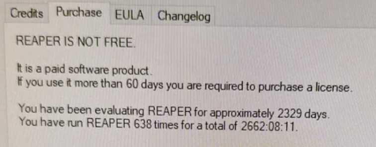 Is this from your Reaper install? I assume you know that Reaper licenses are good for the current major version and the next one. Maybe your license is out of date? I bought my first Reaper license on v2, so it was good for v2 and v3. When v4 was released, I bought a new license ($60) for v4 and v5. When v6 was released, I bought another one for v6 and v7. It’s on v7.66 now, so I’m good until v8 is released. Reaper is so capable, that $60 for years of updates is almost free, especially if I compare that to a $60 dinner out, which exits the body less than 24 hours later.