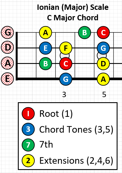 Yes, exactly, the Ionian. Regardless of the pattern, that’s what it is. On my six-string (what do I call it versus bass?) I was JUST getting into modes, and look forward to getting there with bass. I realize there aren’t the CAGED shapes for scales, then tying them all together to move all over, but there is something that is equivalent on bass. I don’t know what that is yet, but I’m happy to see that since the first 4 strings are the same, I can apply things that I was beginning to understand on my six-string to the bass.