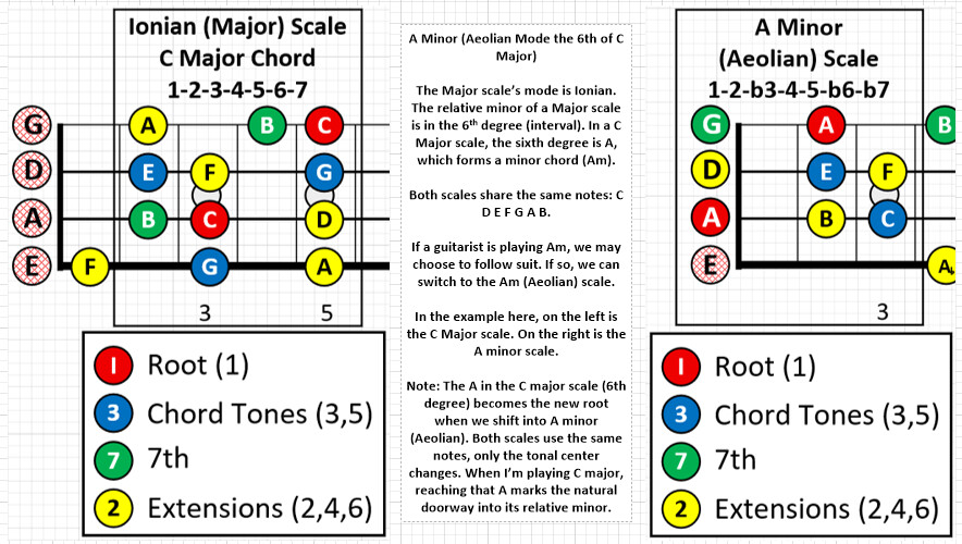 If a guitarist is playing Am, we may choose to follow suit. If so, we can switch to the Am (Aeolian) scale. In the example here, on the left is the C Major scale. On the right is the A minor scale. Note: The A in the C major scale (6th degree) becomes the new root when we shift into A minor (Aeolian). Both scales use the same notes, only the tonal center changes. When I’m playing C major, reaching that A marks the natural doorway into its relative minor.